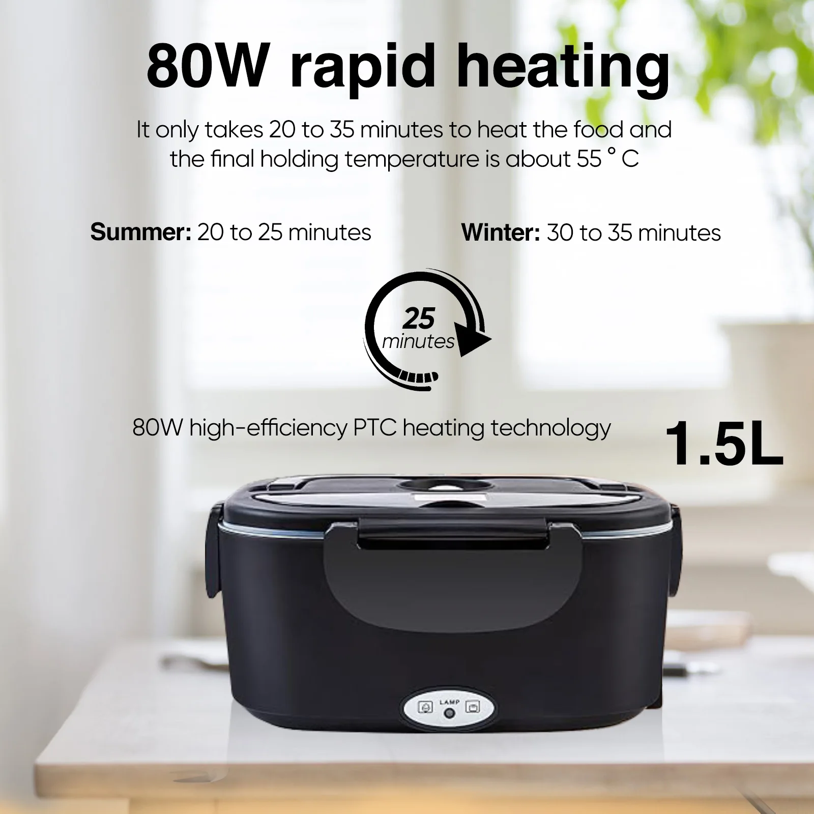 【12/24/220V】 Dual voltage of 220V-12V/24V for household and automotive use. With this electric lunch box, you can heat food anytime and anywhere without queuing. It can be used on the road, in the office or even in a truck. It is a healthy and practical way of eating. Please ensure that the heating base and cable of the lunch box are dry before heating.