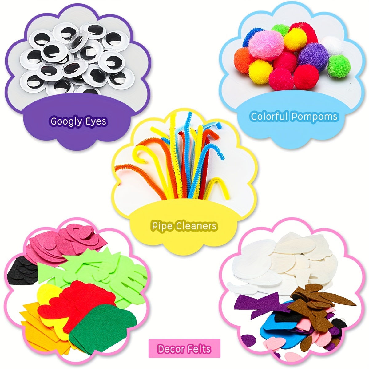 Package comes with 12 pcs colorful hand puppets, 1 bundle pipe cleaners, 1 bundle pompoms, 1 bundle googl eyes, 1 bundle felt decors and a paper box. Note: The glue is not included. It is recommended to use hot melt glue to complete this project.