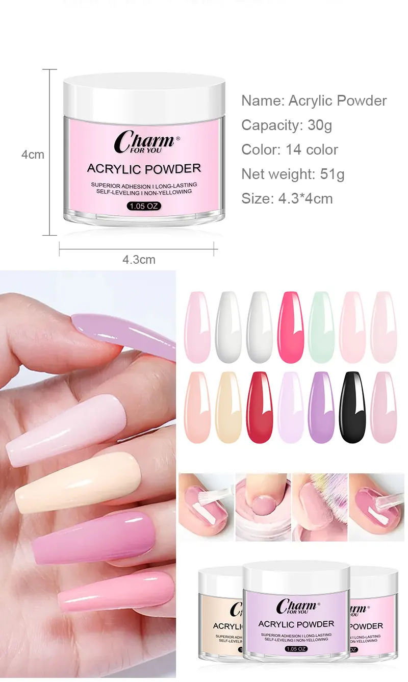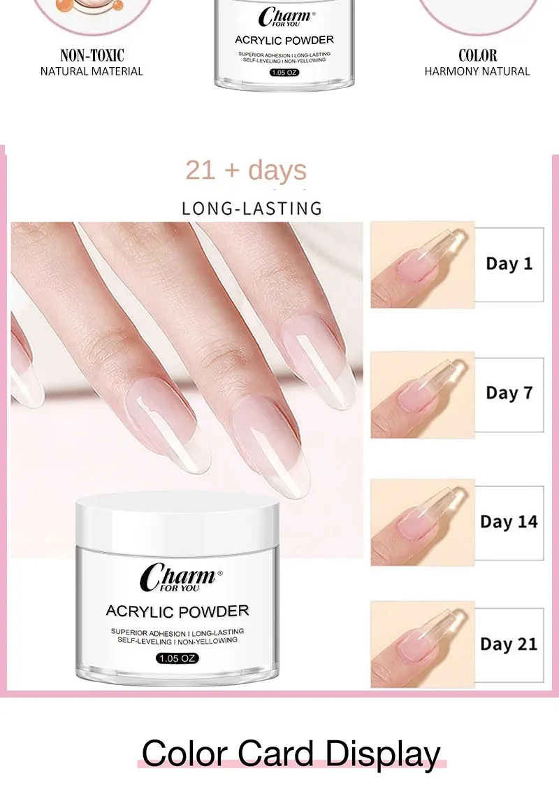 â ăLong lastingă: The super fine acrylic crystal powder is easy to shape, it dries naturally without curing with a nail lamp and forms a hard protective layer that lasts at least 28 days without lifting, cracking or peeling