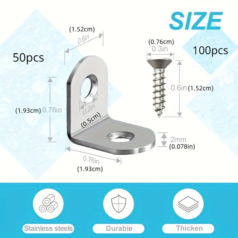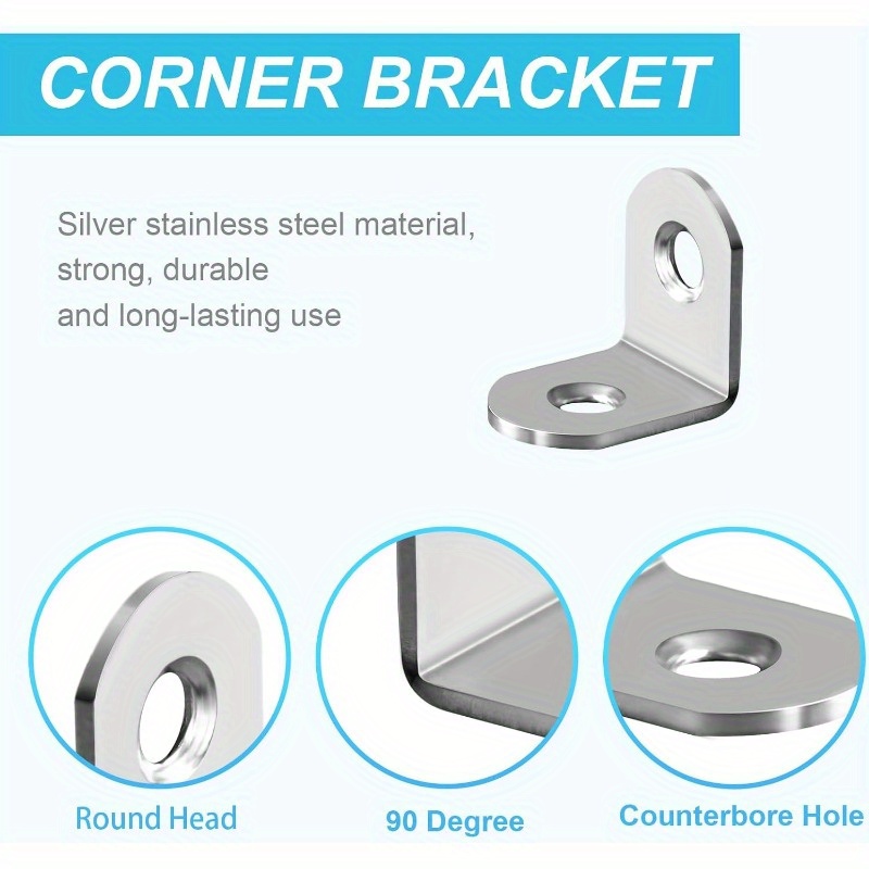 SPECIFICATIONSItem ID: RG57129Material: 304 Stainless Steel150pcs/set, 50pcs L-shaped Bracket Corner Bracket Metal Corner Bracket 90 DegreeSKU: 18167009$16.87PriceQuantity*150pcsAdd to CartBuy Now