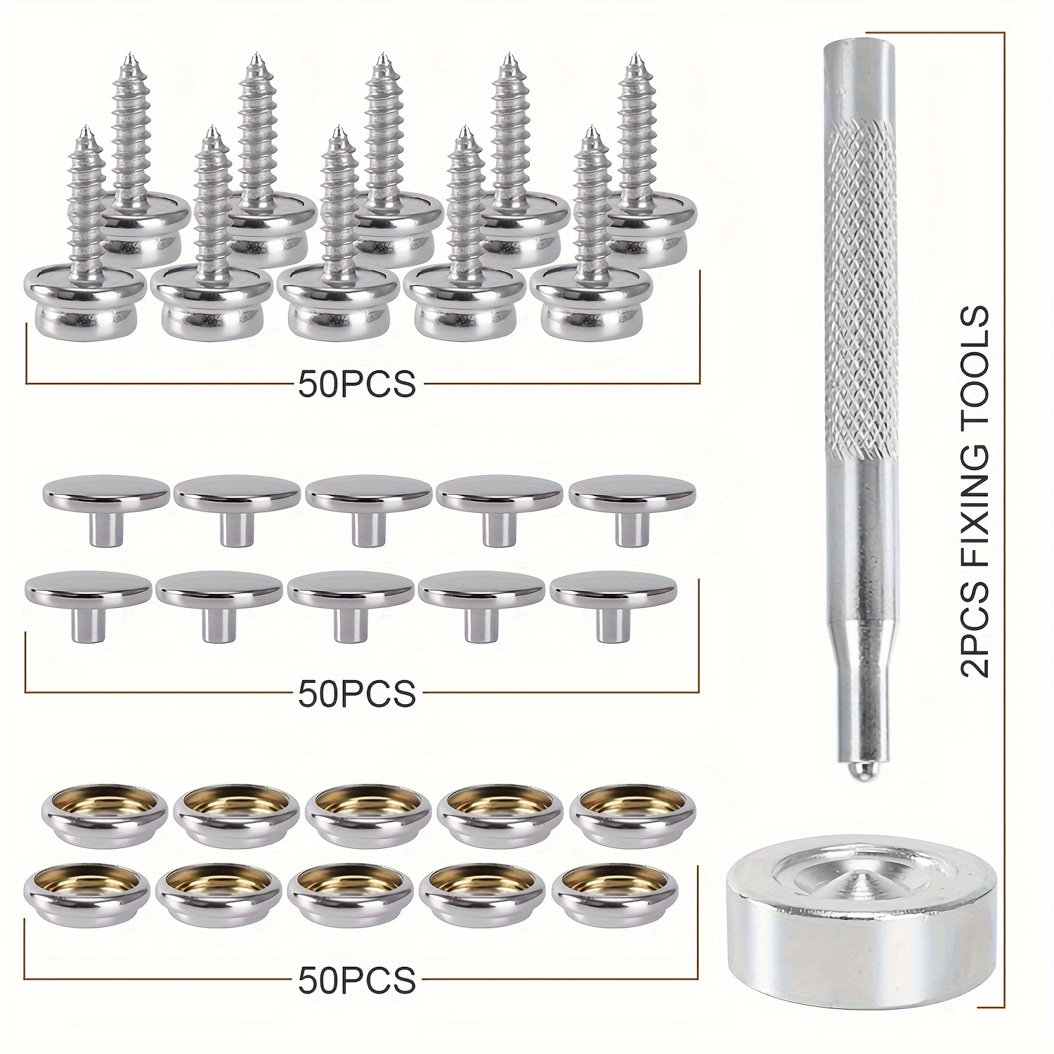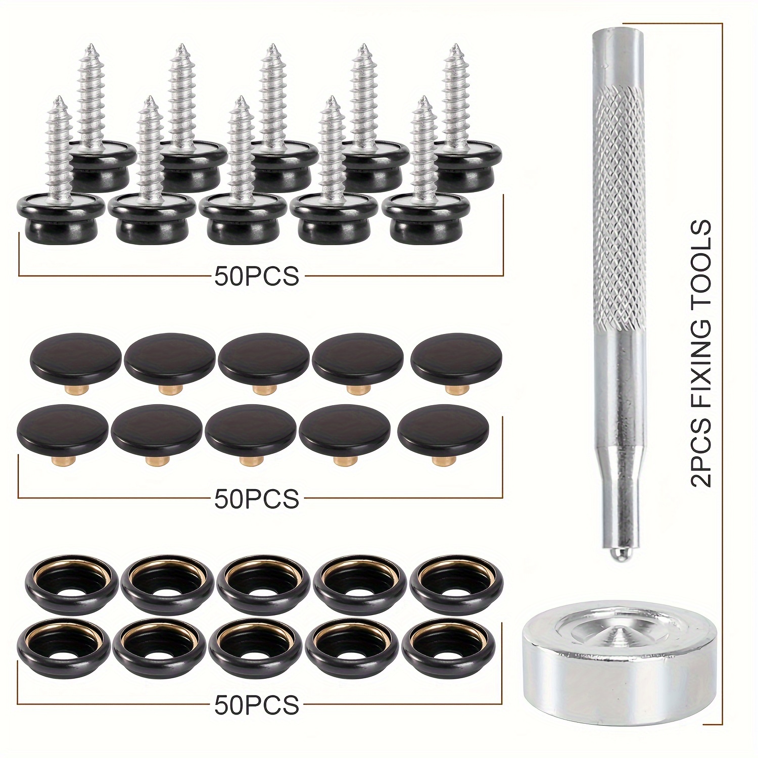 4. Package includes 50 pcs screws + 50 pcs sockets + 50 pcs caps, and 2pcs setting tools in a transparent box.