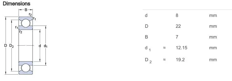 8 x 22 x 7mm (Inner Diameter: 8mm, Outer Diameter: 22mm, Width:7mm)