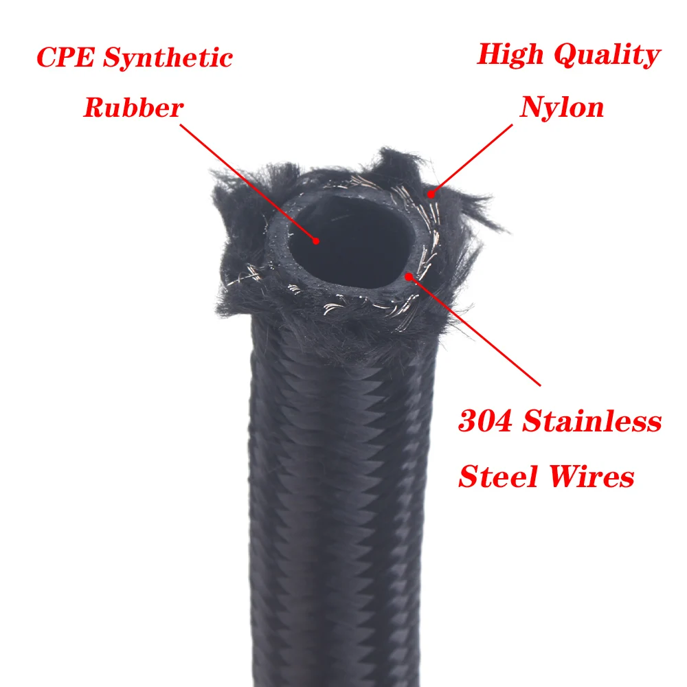 -Made of durable CPE synthetic rubber tube, and bonded and fixed by nylon and 308 stainless steel outer braid.