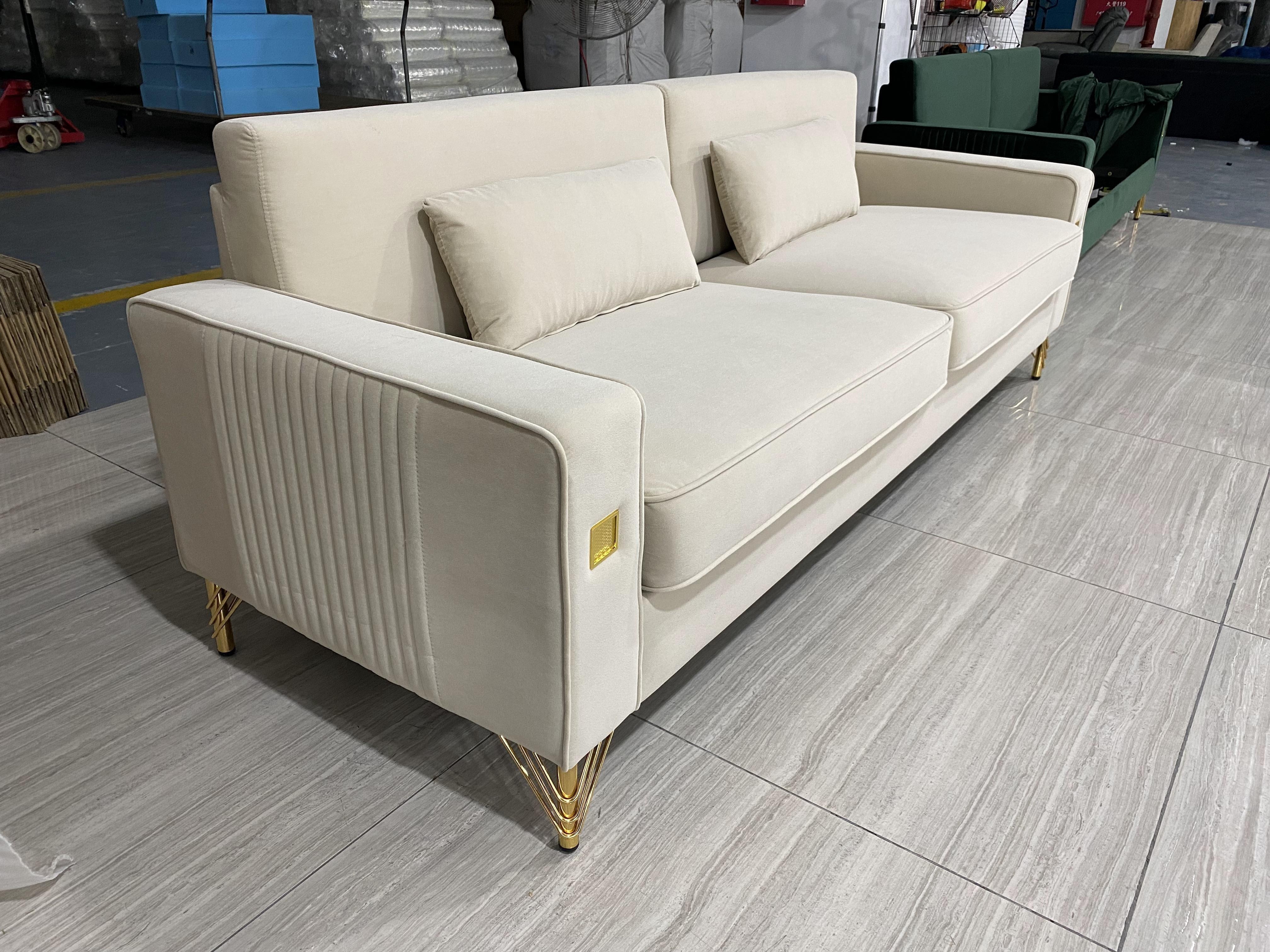 Includes 2 spacious seat cushions filled with high-resilience sponge and spring package, providing you with the ultimate comfort experience. Durable metal frame with slim gold-finished legs and broad track arms. Adaptable design that complements any interior style.