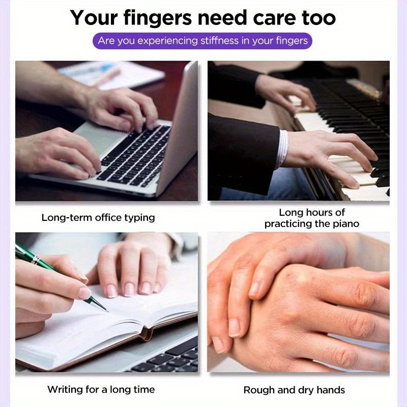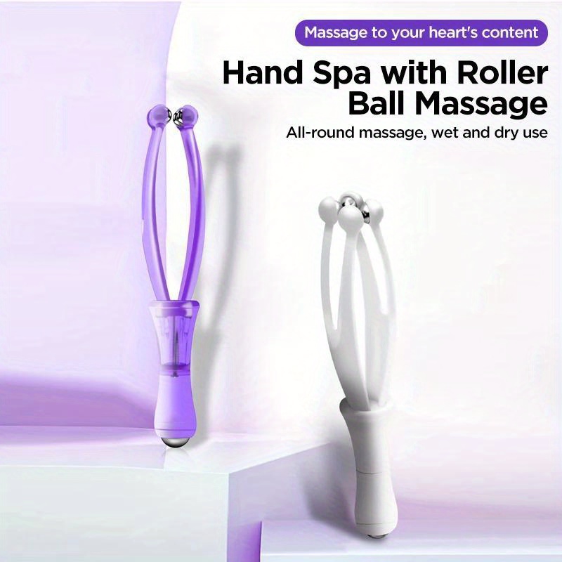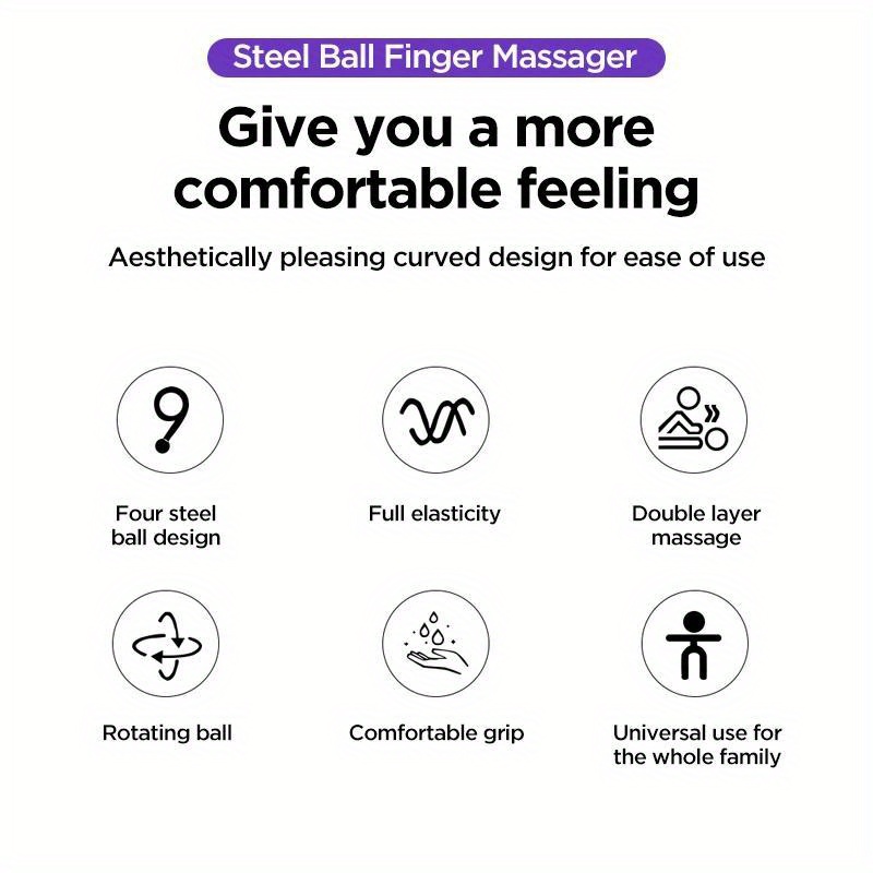 Description of the product: Material: PC+ electroplated steel ball Color: White, purple Features of the product: 1. Massaging different parts of the fingers can effectively relieve finger fatigue and nerve fatigue caused by long-term work. 2. Ball massage, hand SPA, full range massage, suitable for both dry and wet conditions. 3. 360° rotating massage bead provides gentle finger massage. 4. Tail ball point with appropriate curvature and size for easy pressure on finger points.