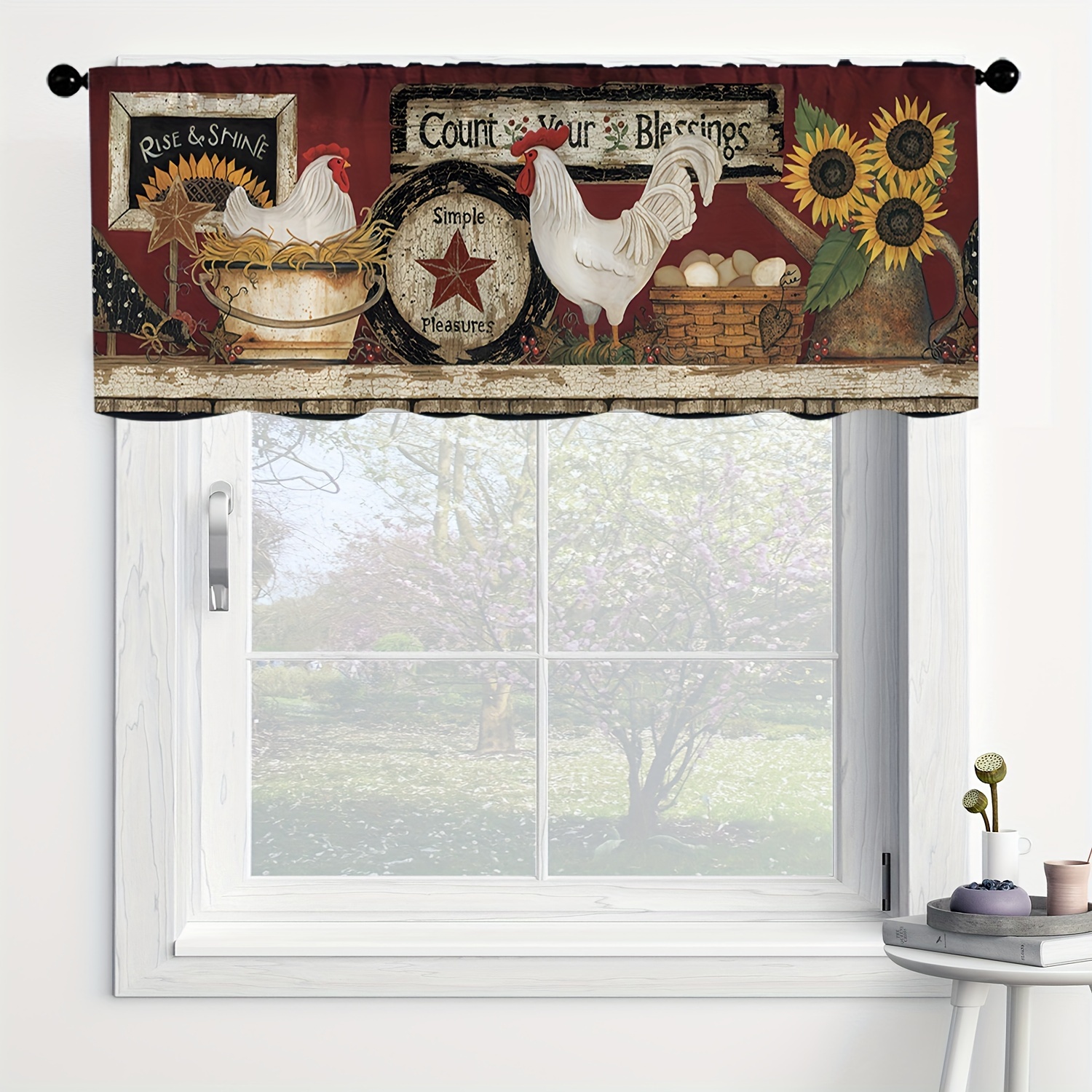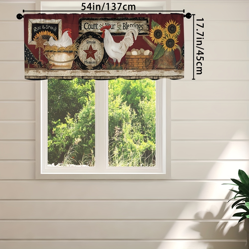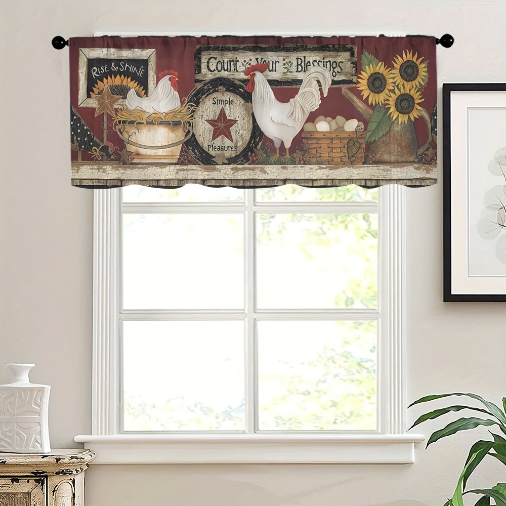 1pc Rooster Sunflower Farmhouse Kitchen Curtain, Brown Background Egg Basket Sun