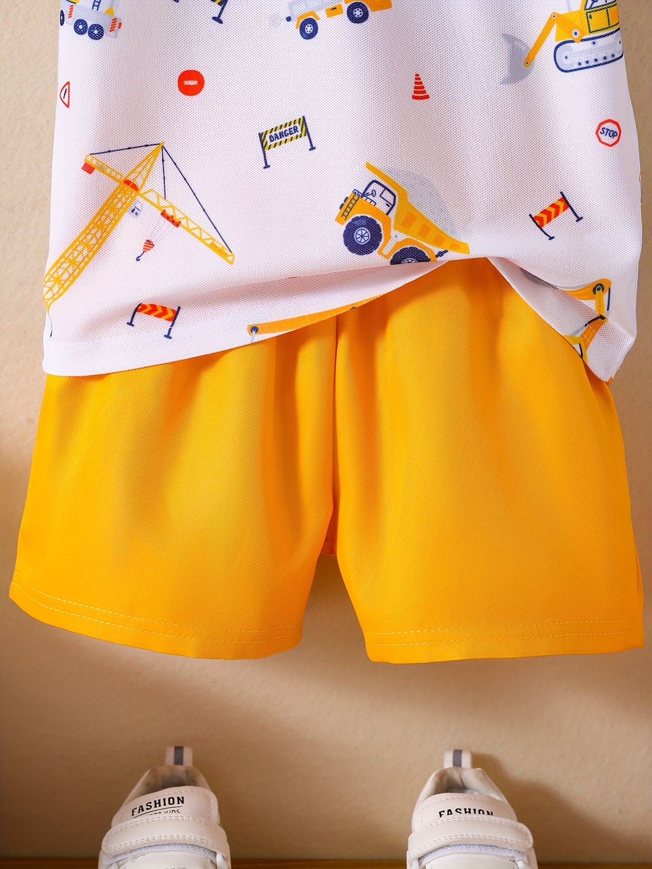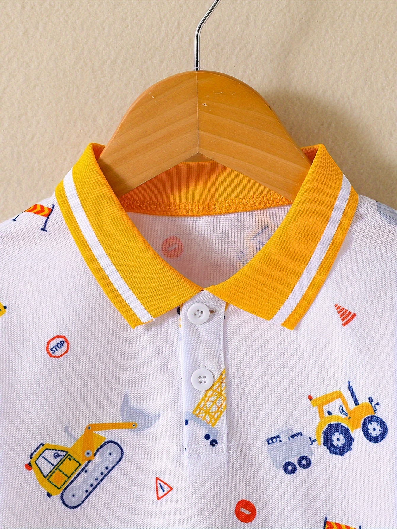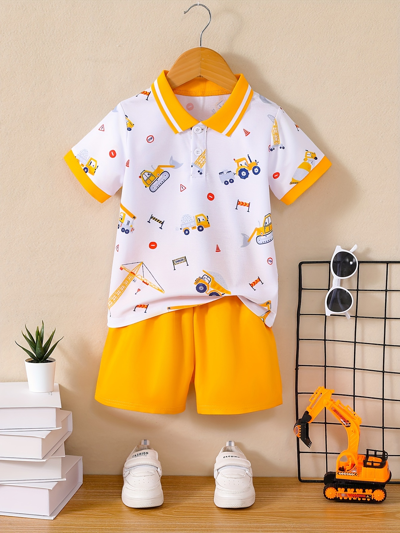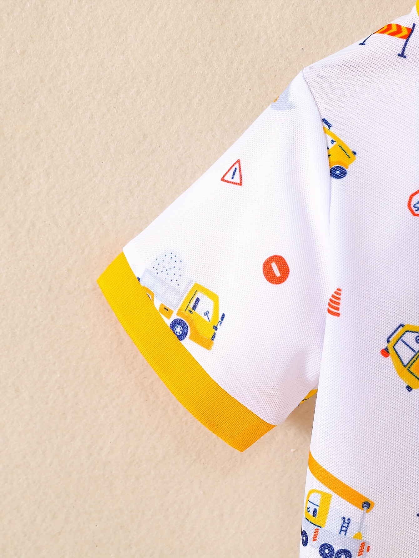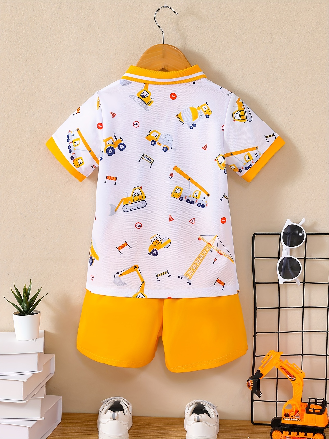 2pcs Boys Casual Cartoon Construction Truck Graphic Print Short Sleeve Lapel Shi