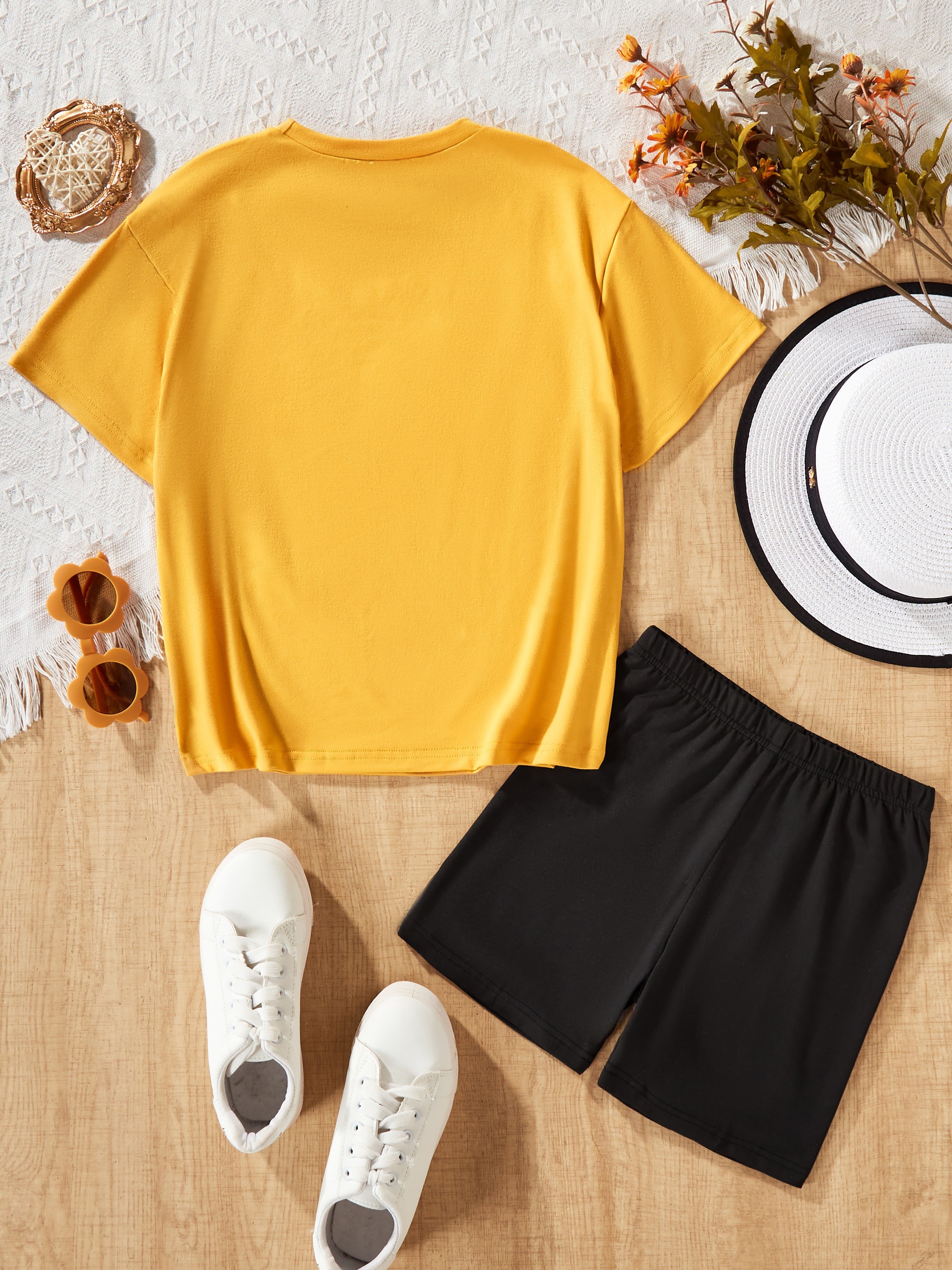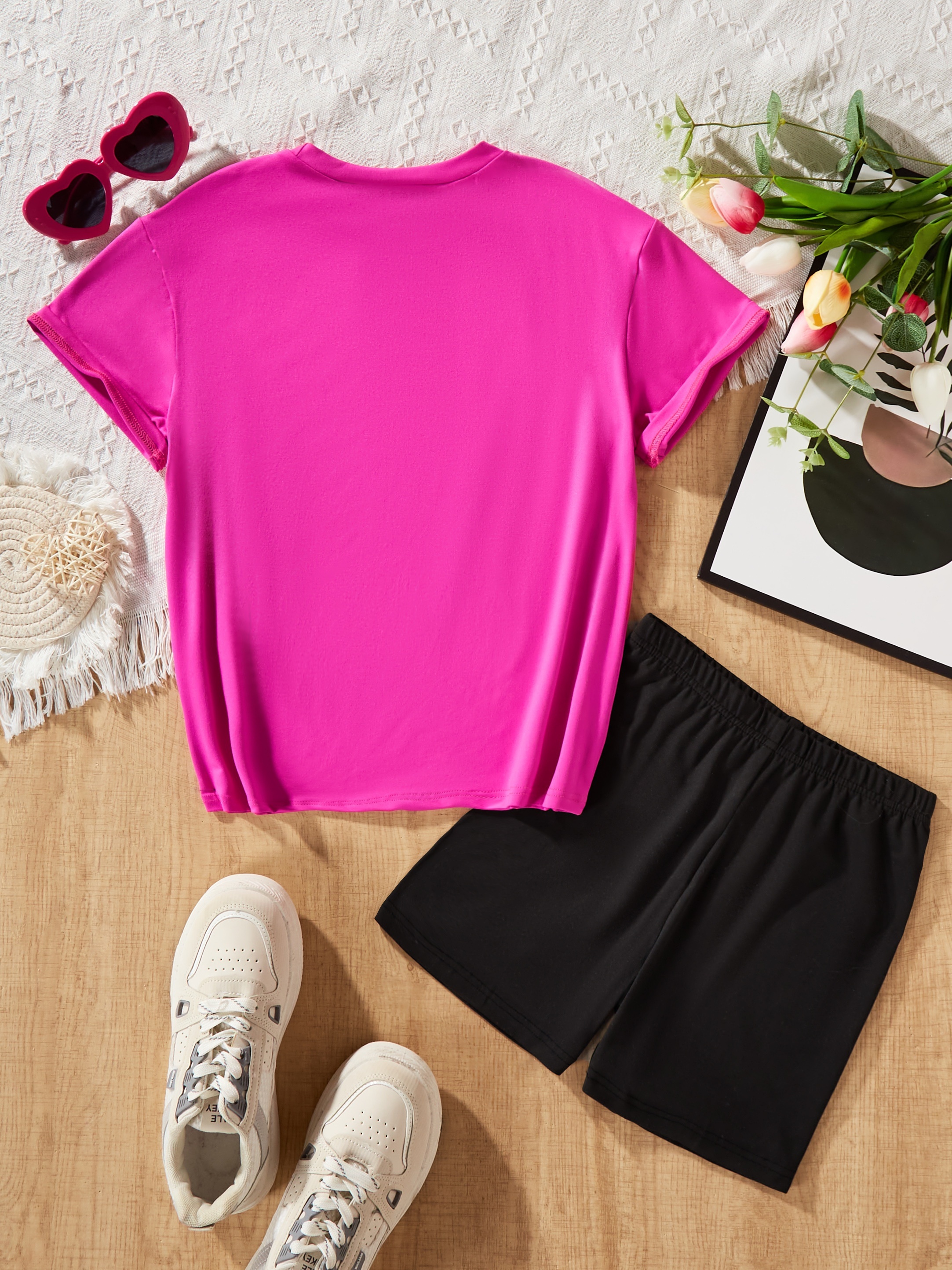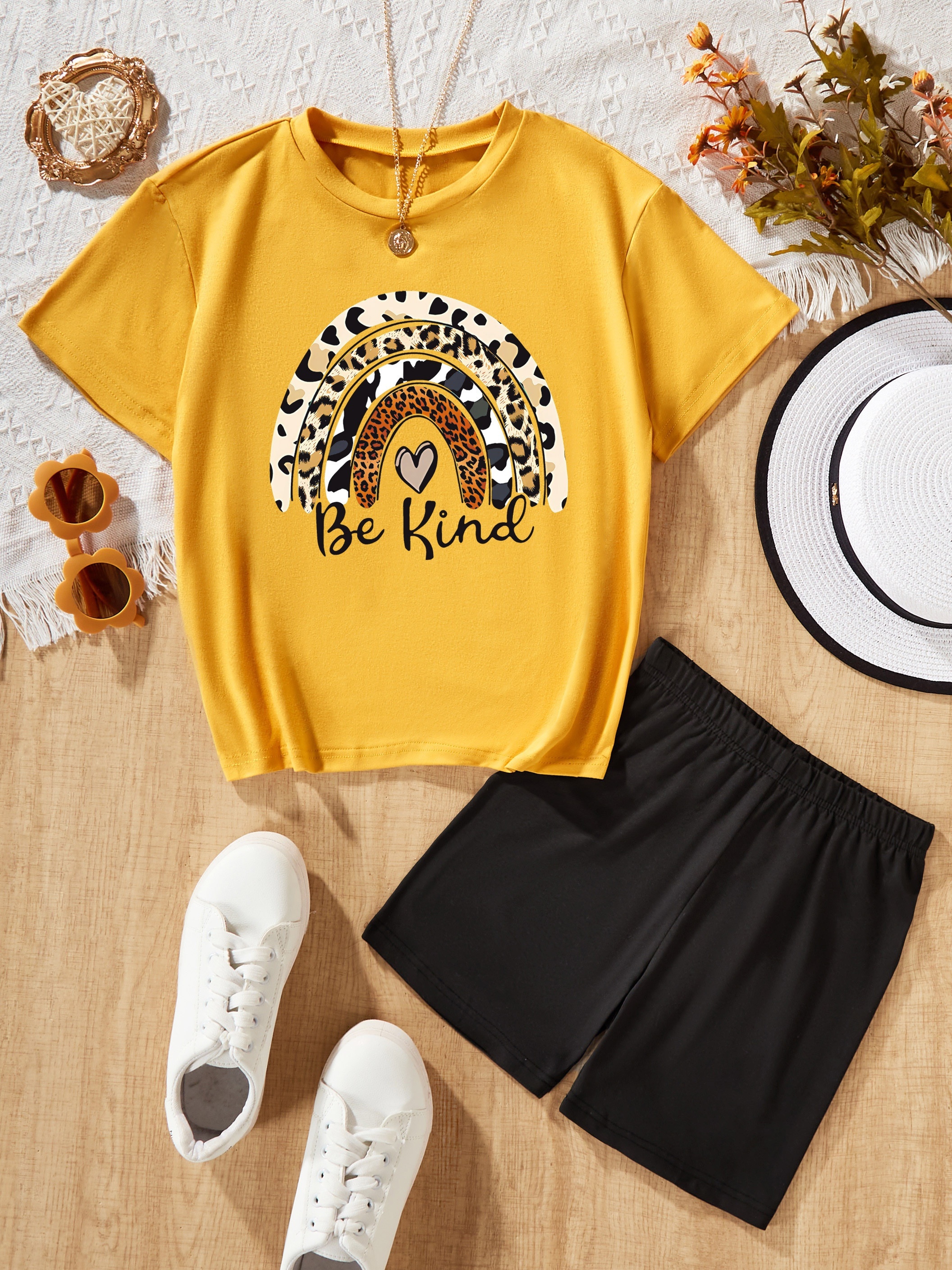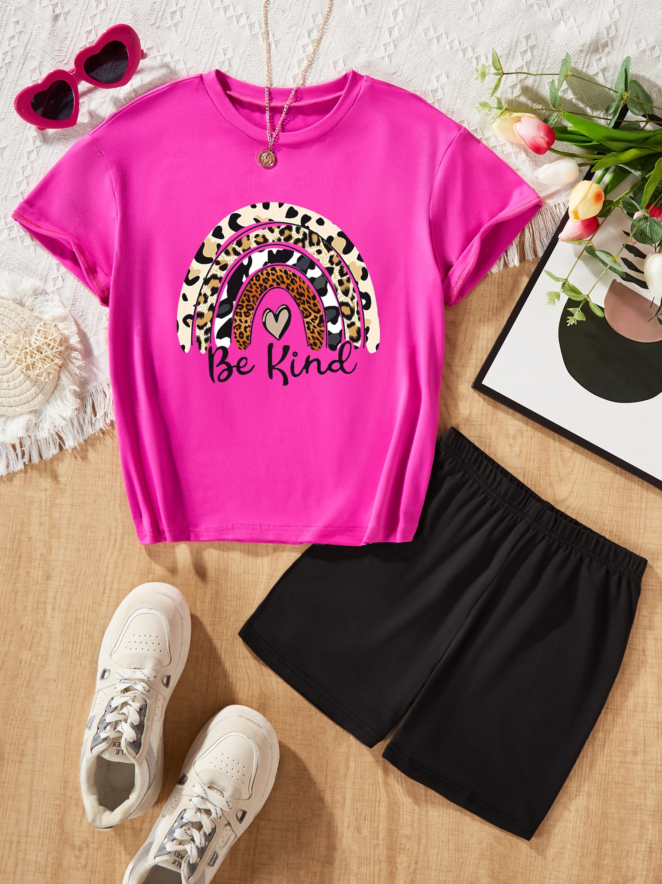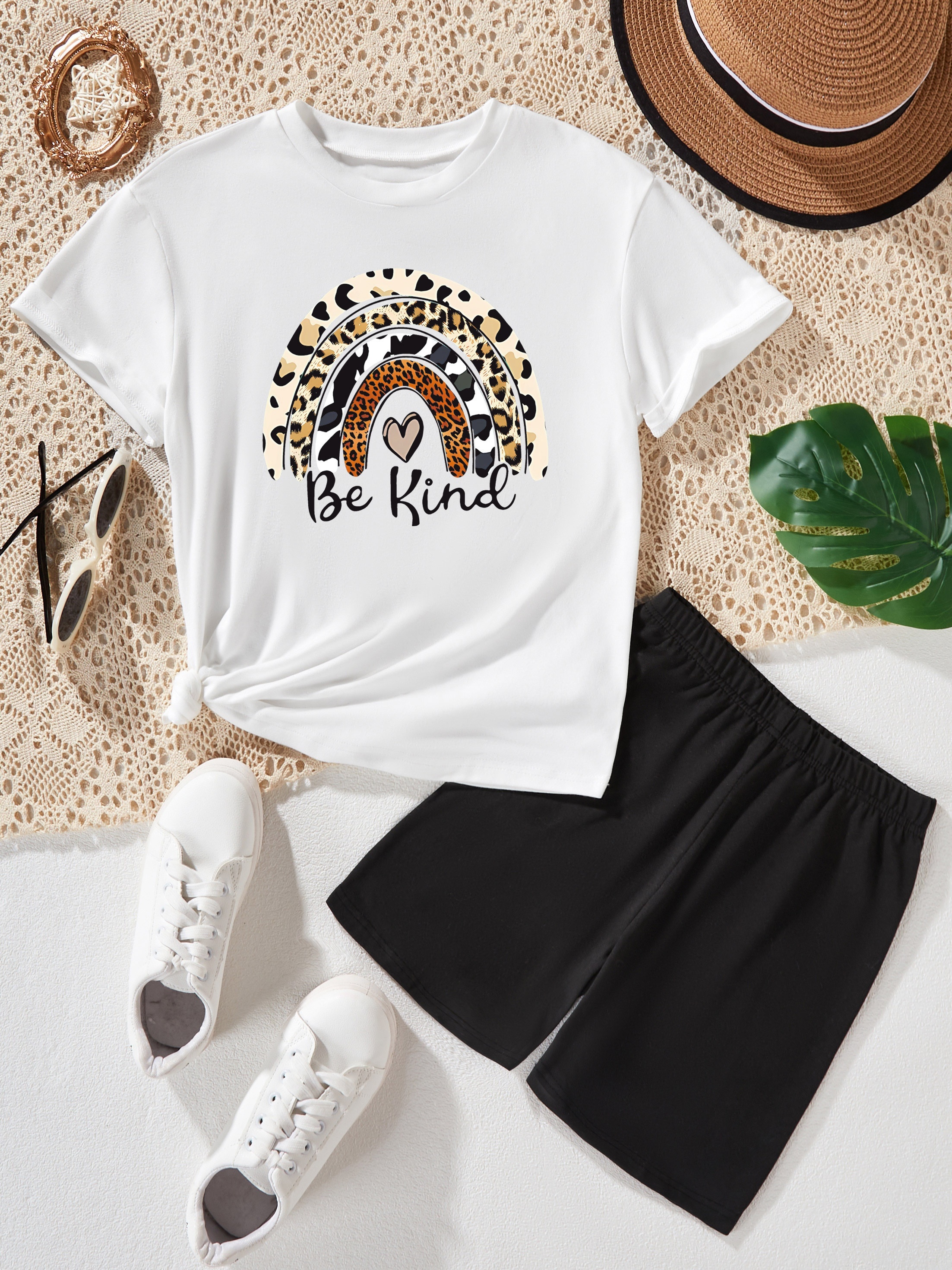 2pcs Girl's BE KIND Print Summer Outfit, T-shirt & Casual Shorts Set, Girl's Clo