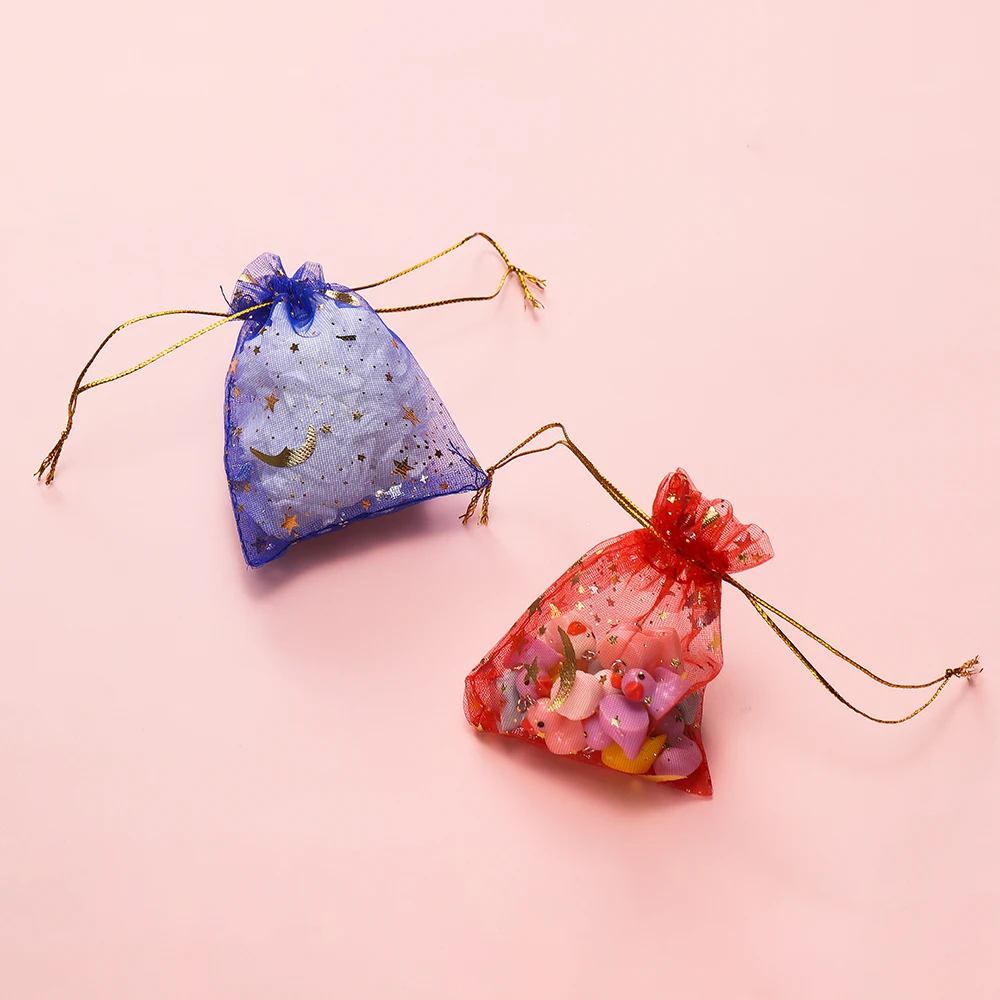 50pcs/Lot 7x9 9x12 10x15 13x18cm Printing Star Moon Christmas Organza Sack Drawstring Charm Packaging Bags Daily Jewelry Making