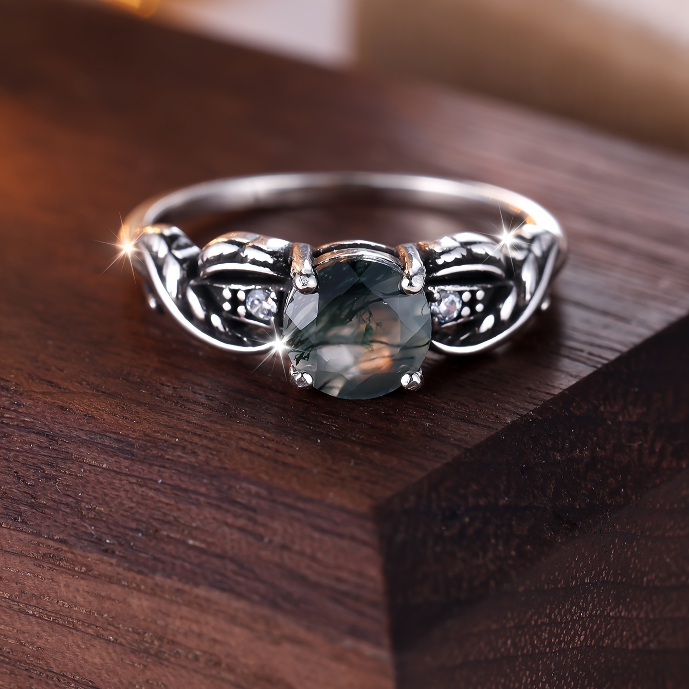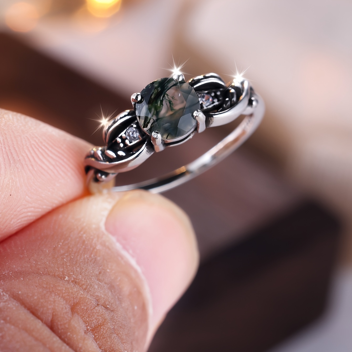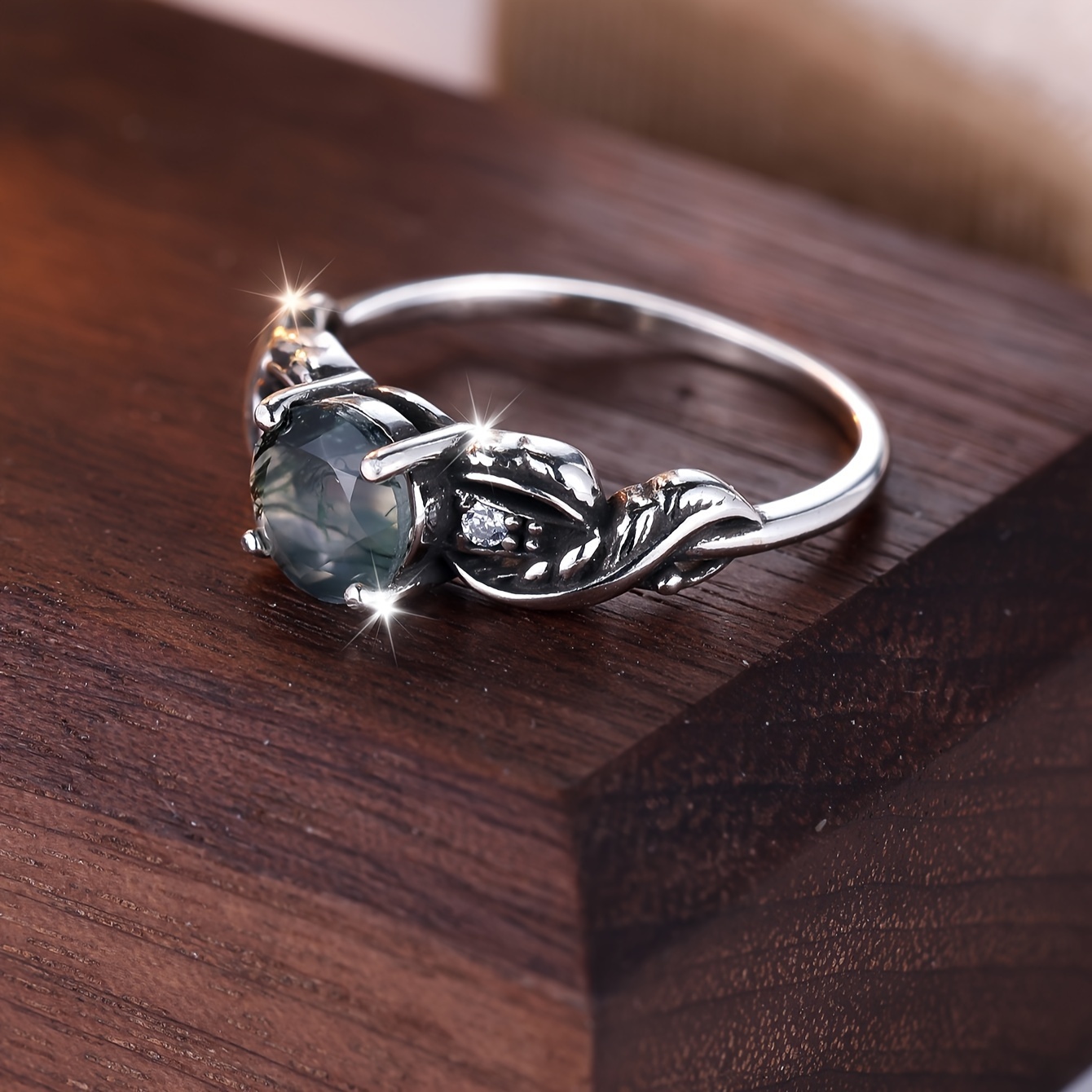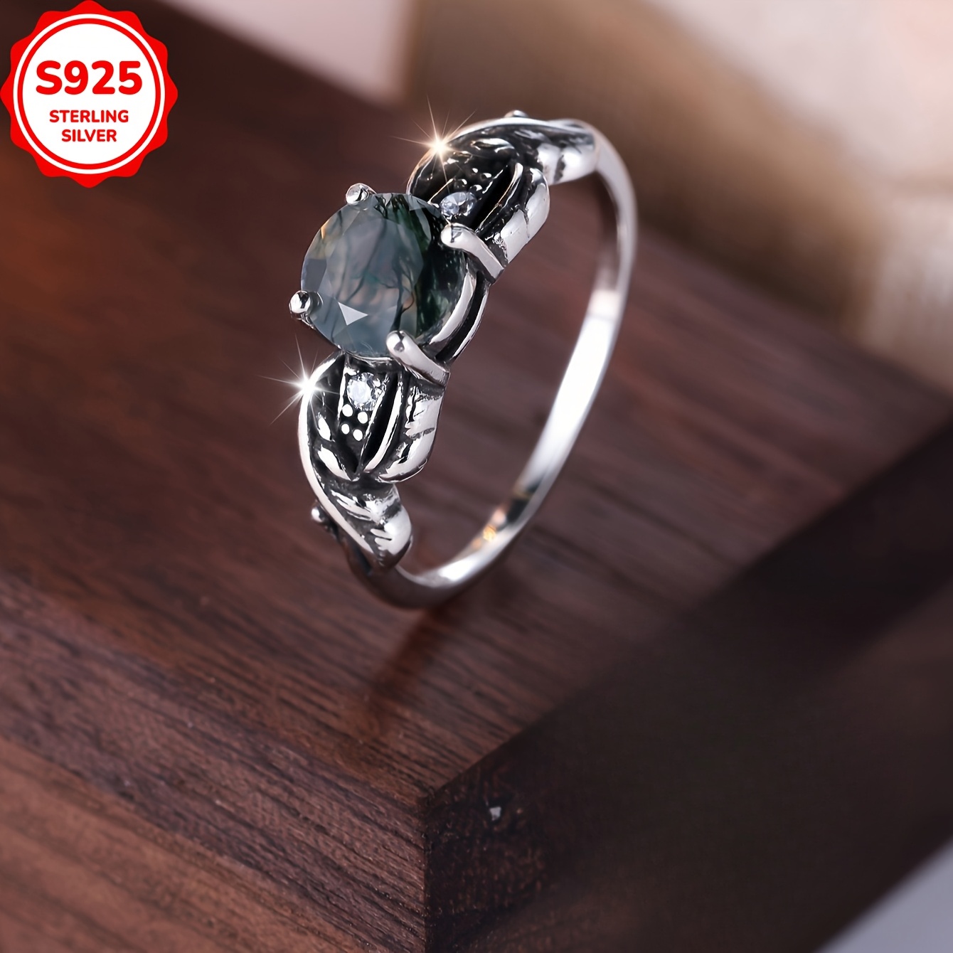 925 Sterling Silver Ring Inlaid Moss Agate Retro Carving Symbol Of Elegance And