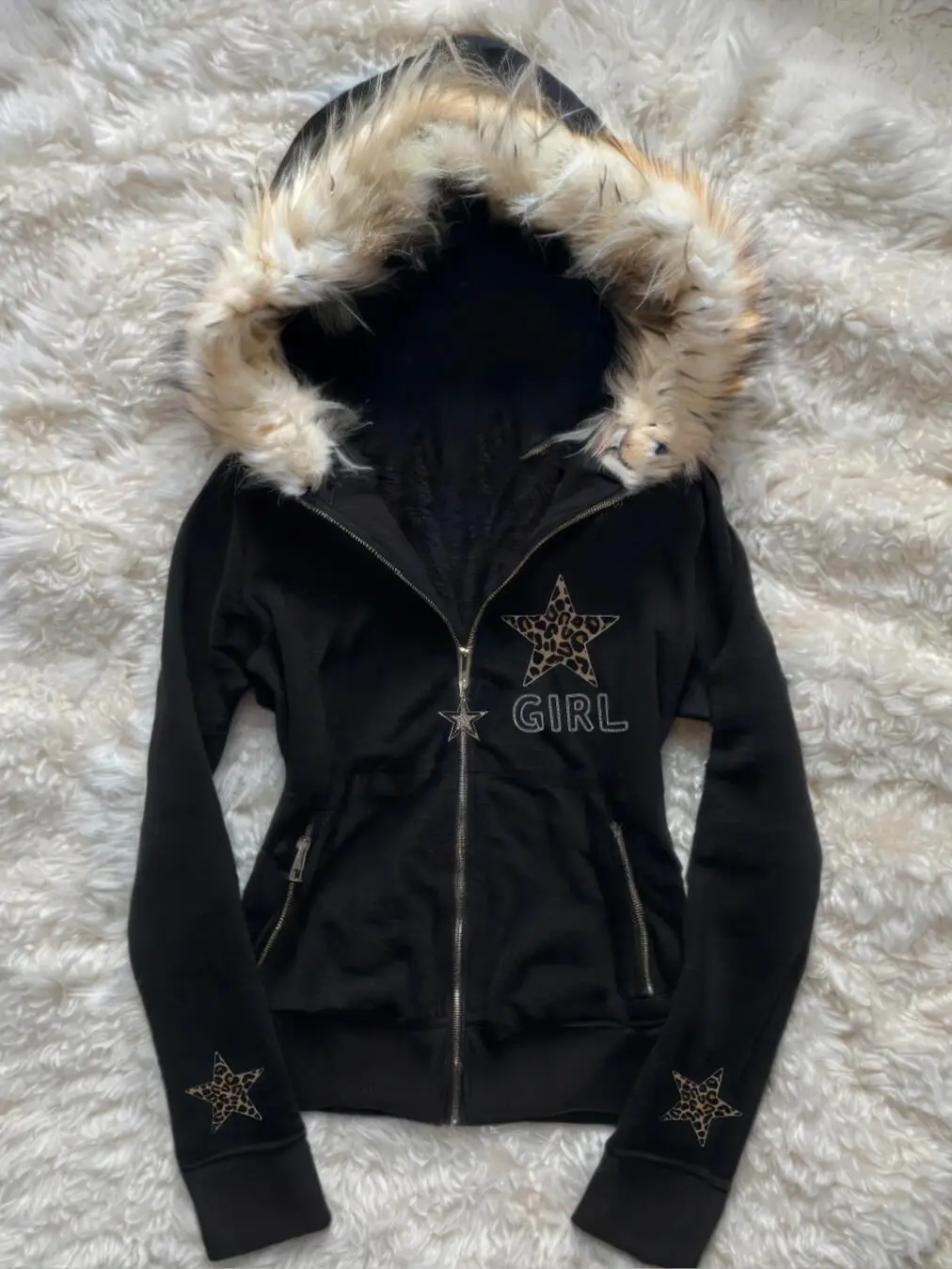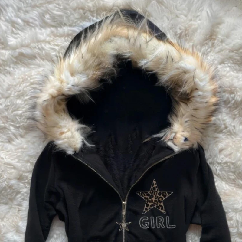 Autumn and winter retro black star leopard pattern women fur collar zipper hoodie fashionable street Harajuku waist jacketSize chart:S:Bust 104 Shoulder 60 Sleeve 51 Length 70