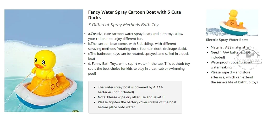 ⛵【3 Different Spray Methods】- Tub toy Packaging: boat*1, revolving duck*1, fountain duck*1, drainage duck*1.Turn on the switch of the cartoon boat, put it in the water and it will automatically move forward. Put on the spinning duck, the cute little duck will spin and jump on the boat and spray water; put on the fountain duck, the head of the little duck will instantly turn into a fountain; put the drain duck, the little duck will spray water on every side.