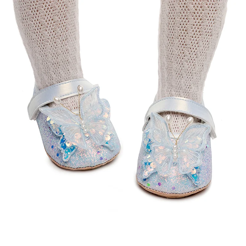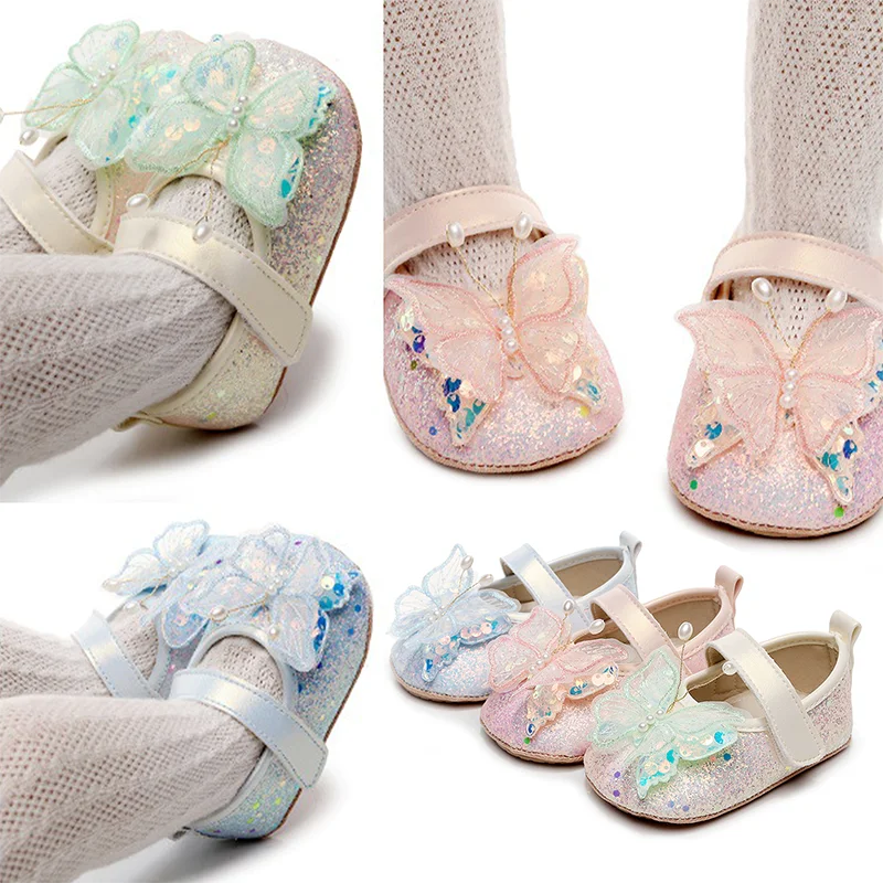 Baby Girl Dress Shoes Shiny 3D Butterfly Princess Mary Jane Flats Non-Slip Crib Shoes
