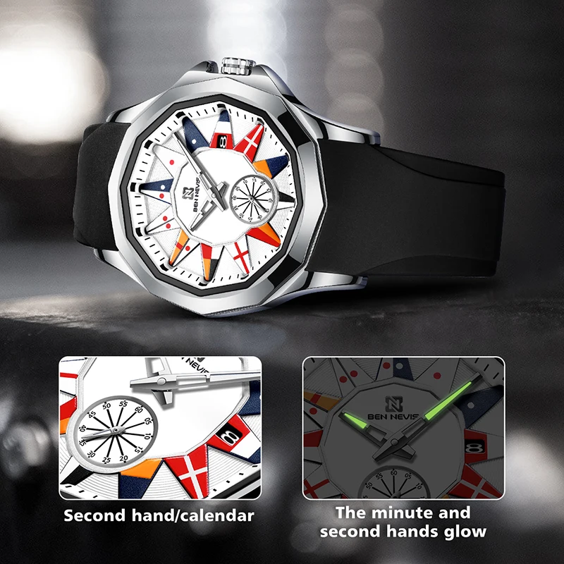 Brand Name : BEN NEVISBand Length : 27cmStyle : Fashion & CasualMovement : QUARTZWater Resistance Depth : 3BarClasp Type : BuckleCase Material : AlloyCase Thickness : 10mmDial Window Material Type : HardlexItem Type : Quartz WristwatchesBand Material Type : SiliconeDial Diameter : 42mmBand Width : 23mmCase Shape : ROUNDFeature1 : luminousFeature2: Complete Calendar