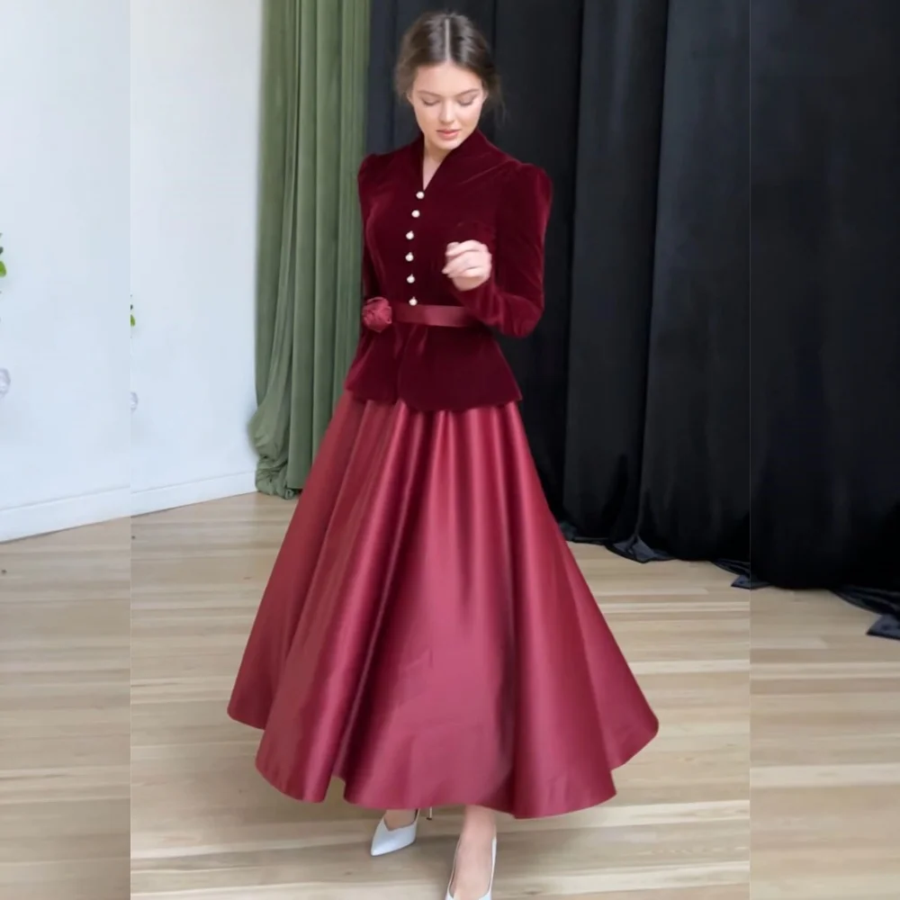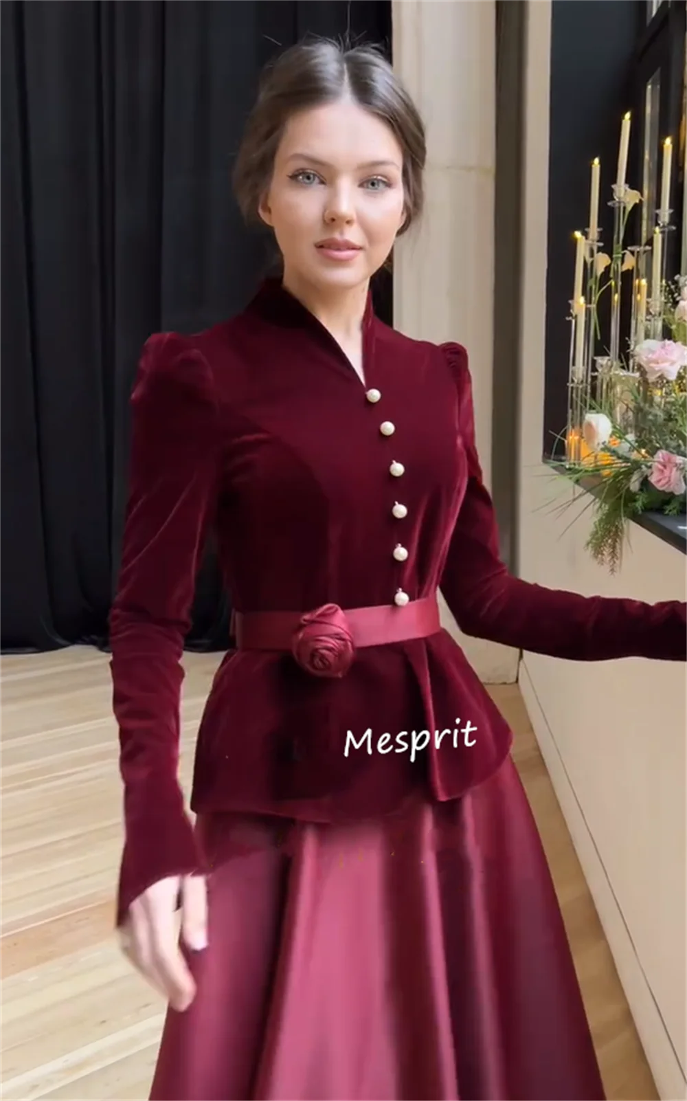 Customized Chinese Style Velour Pearl Sash Flower A-line V-neck Midi Dresses Bes