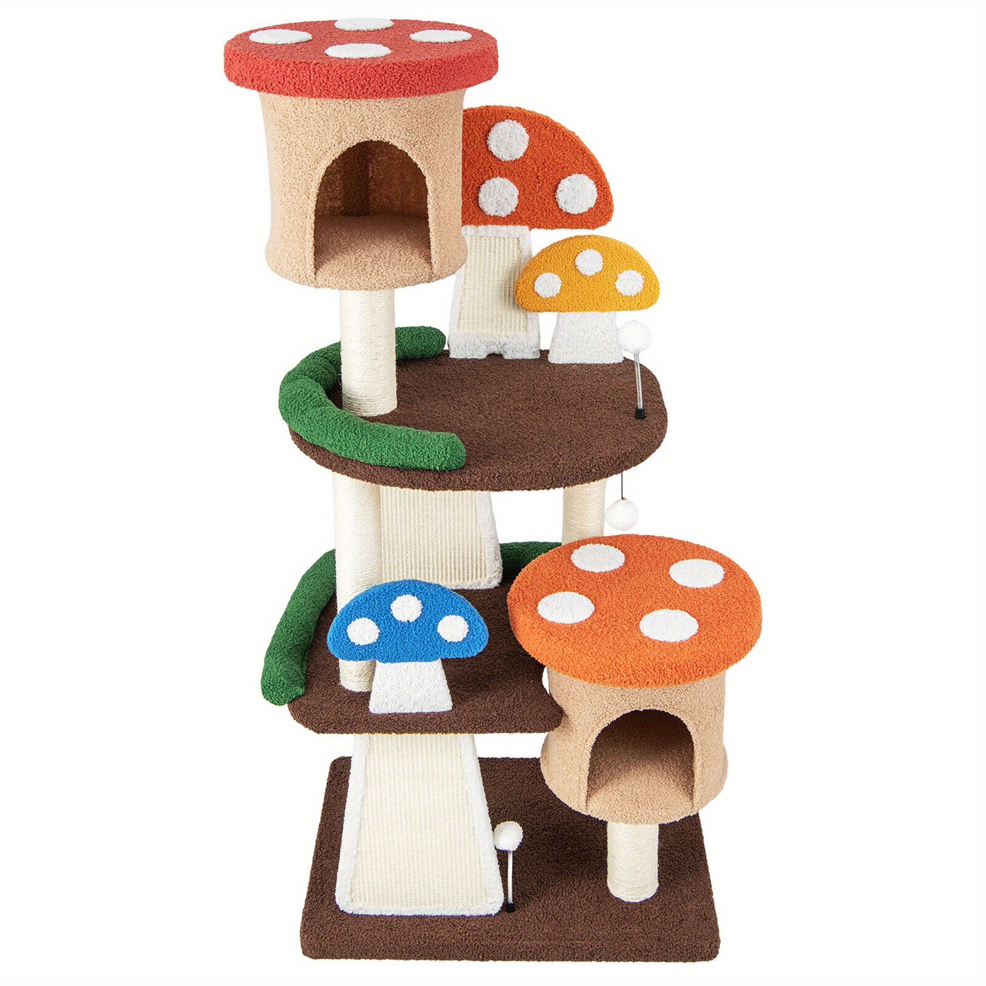 This cat tree resembling a mushroom offers a blend of elegance, practicality, and amusement for your beloved pets. Crafted from sturdy and non-toxic materials, it creates a secure and robust environment for your feline companion to climb, scratch, and relax. Featuring various levels of platforms and condos, cats can effortlessly navigate up and down for their exploration. Two spring-loaded balls capture your cats' interest, while the hanging ball provides entertainment. Moreover, the distinctive mushroom design brings a delightful touch to any space, and the natural sisal posts and scratching boards are both safe and durable, catering to cats' instincts and safeguarding your furniture from damage. Includes a plush cushion covered in soft teddy fabric for added comfort, and a broad padded base for stability. Simple assembly with detailed instructions.