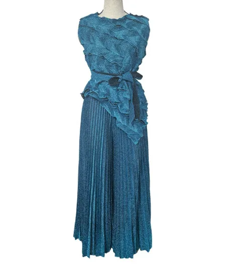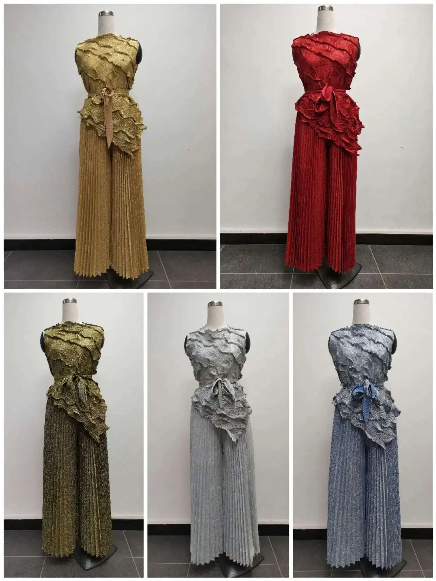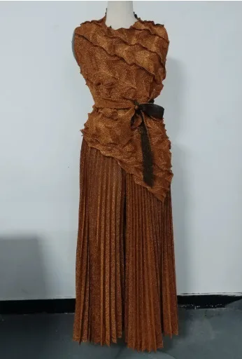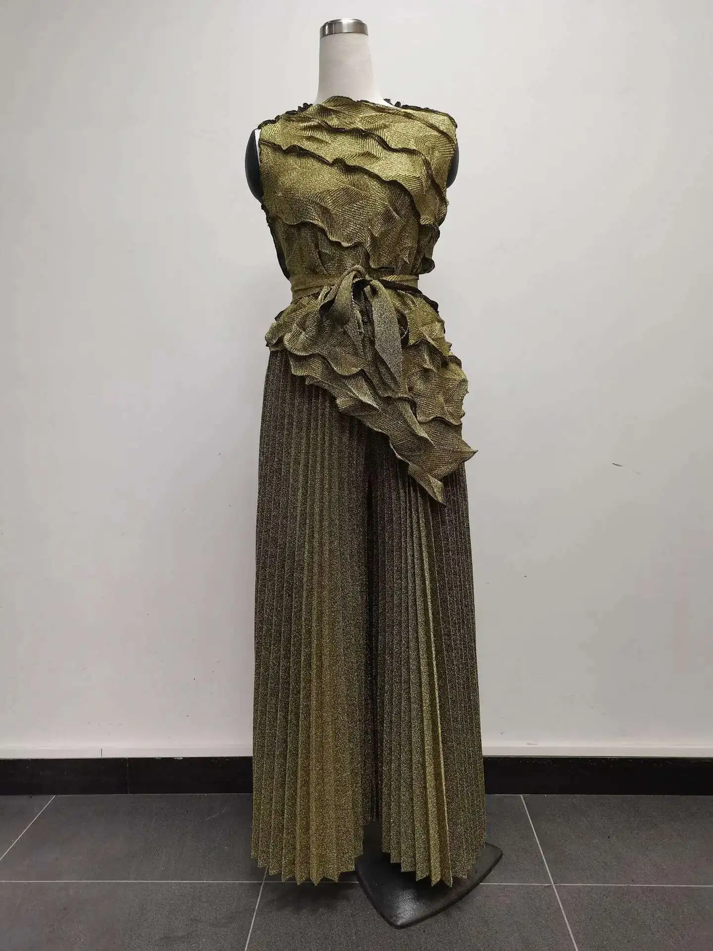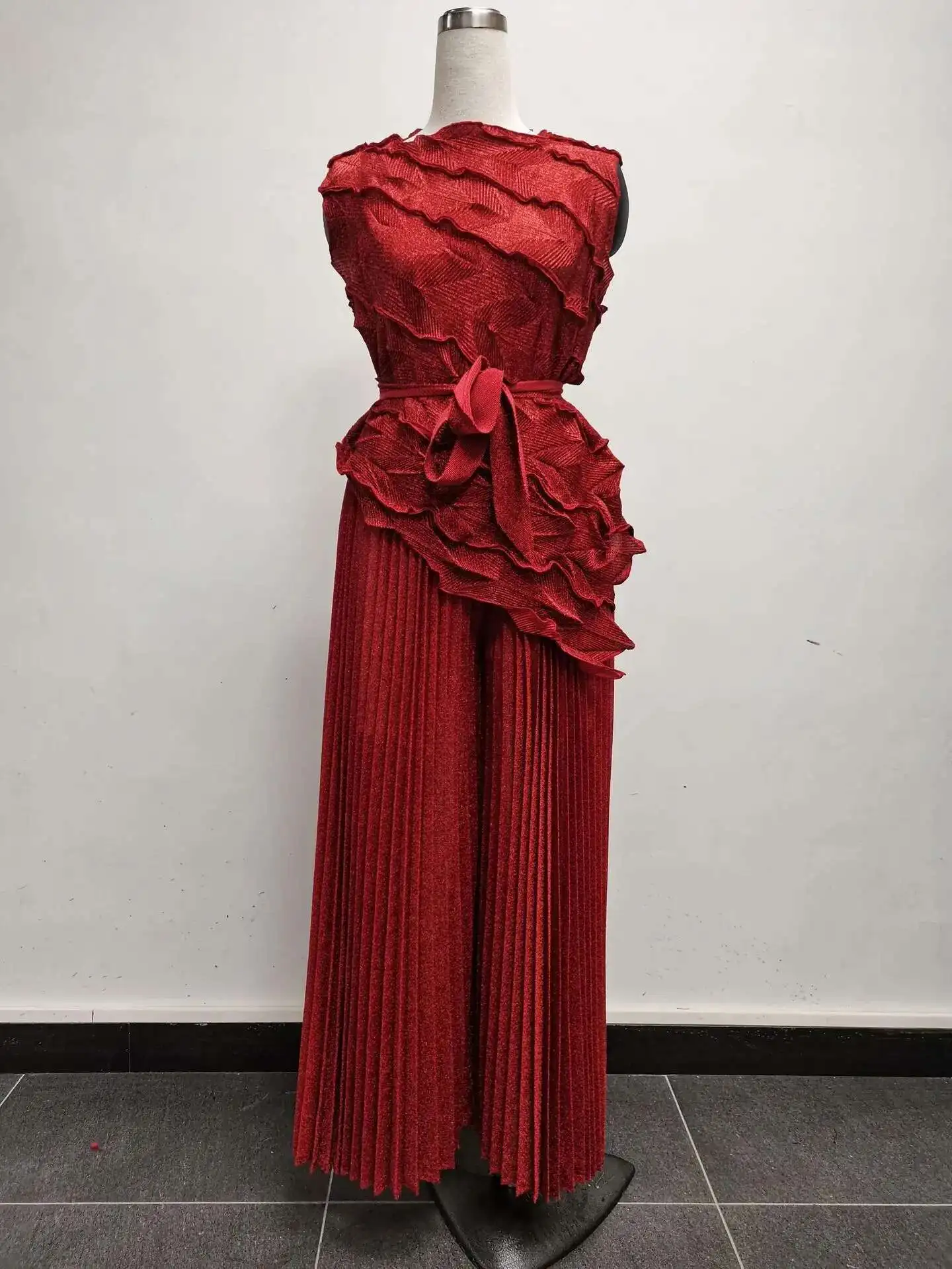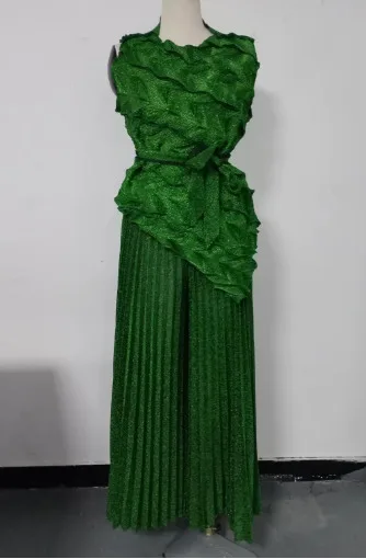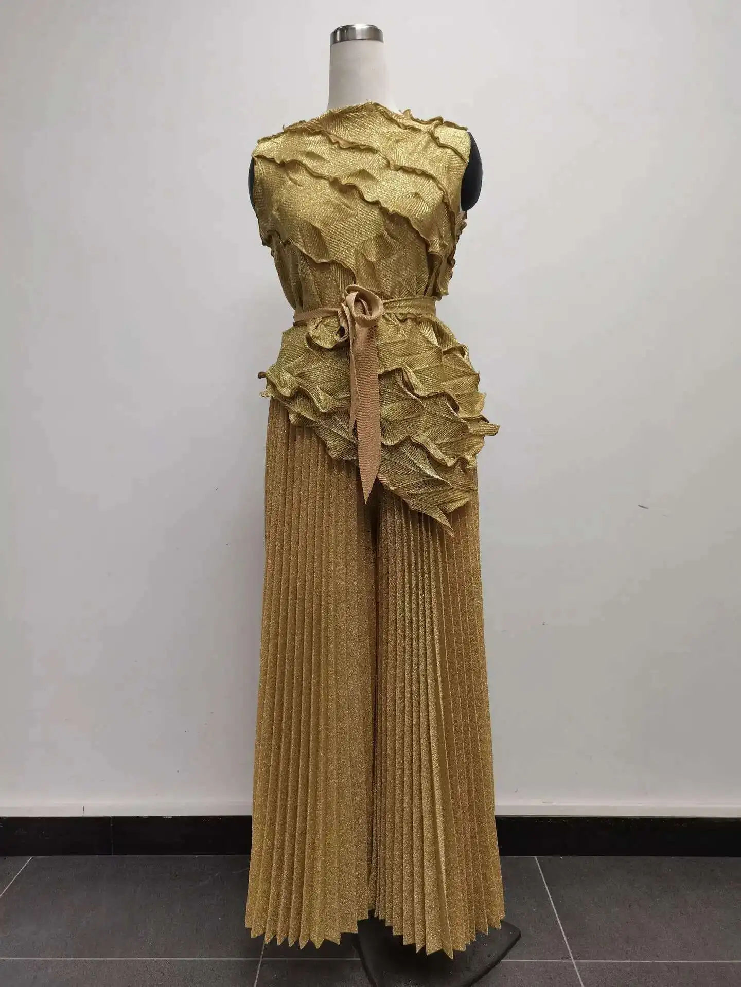 EAEOVNI 2025 Fashion Miyake Pleated Set Women Irregular Design Sleeveless Belt T