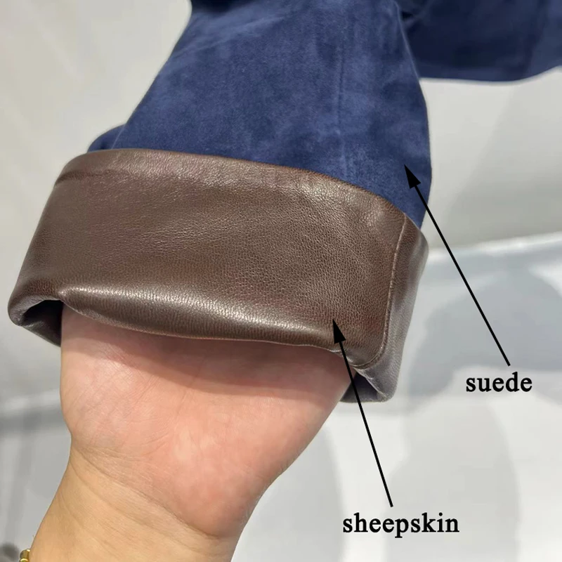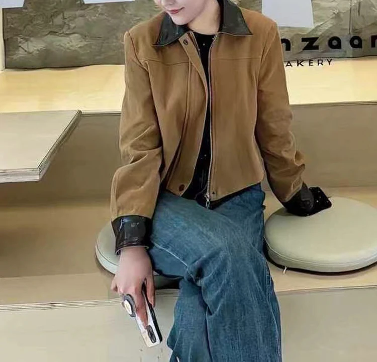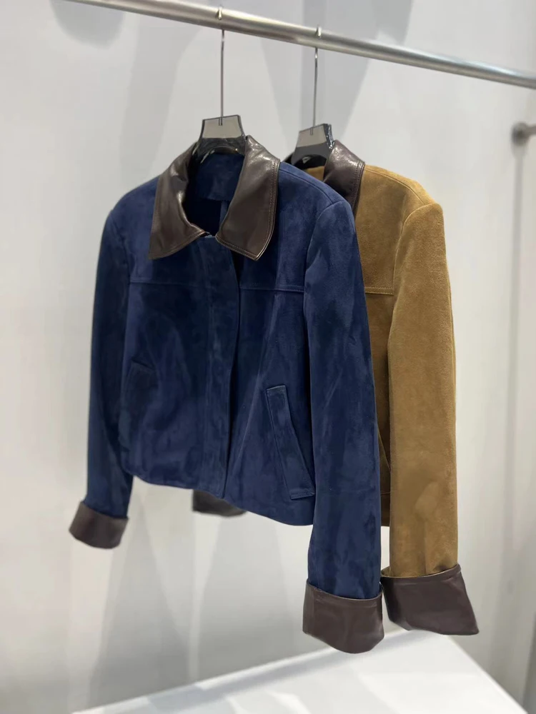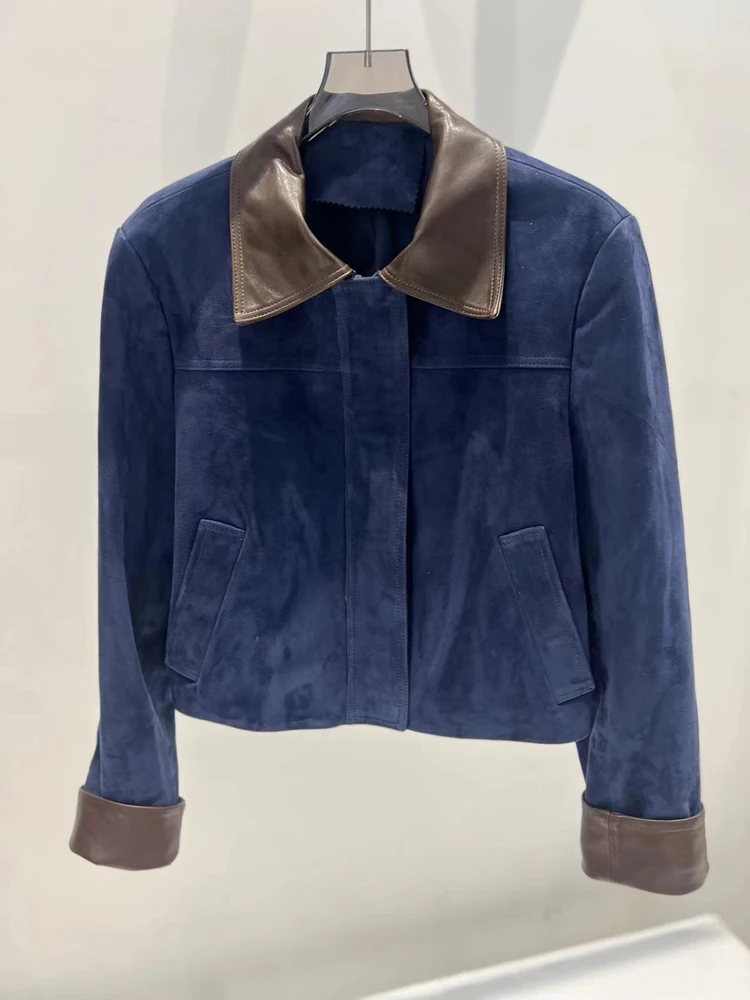 European Imported Suede Jacket Women 2025 Autumn WinterBranded New Contrasting Leather Coat Navy Blue Short Locomotive Casacos