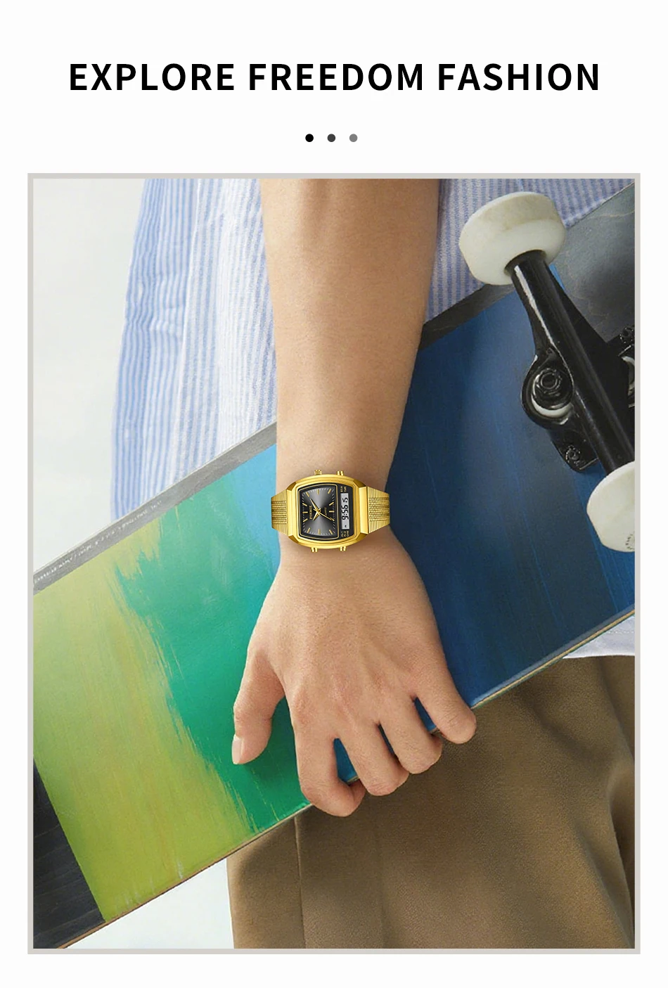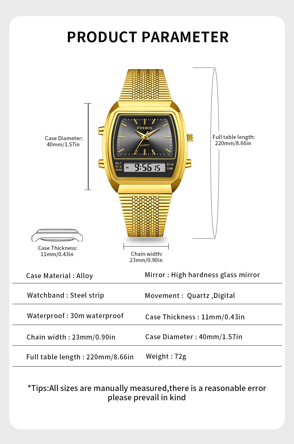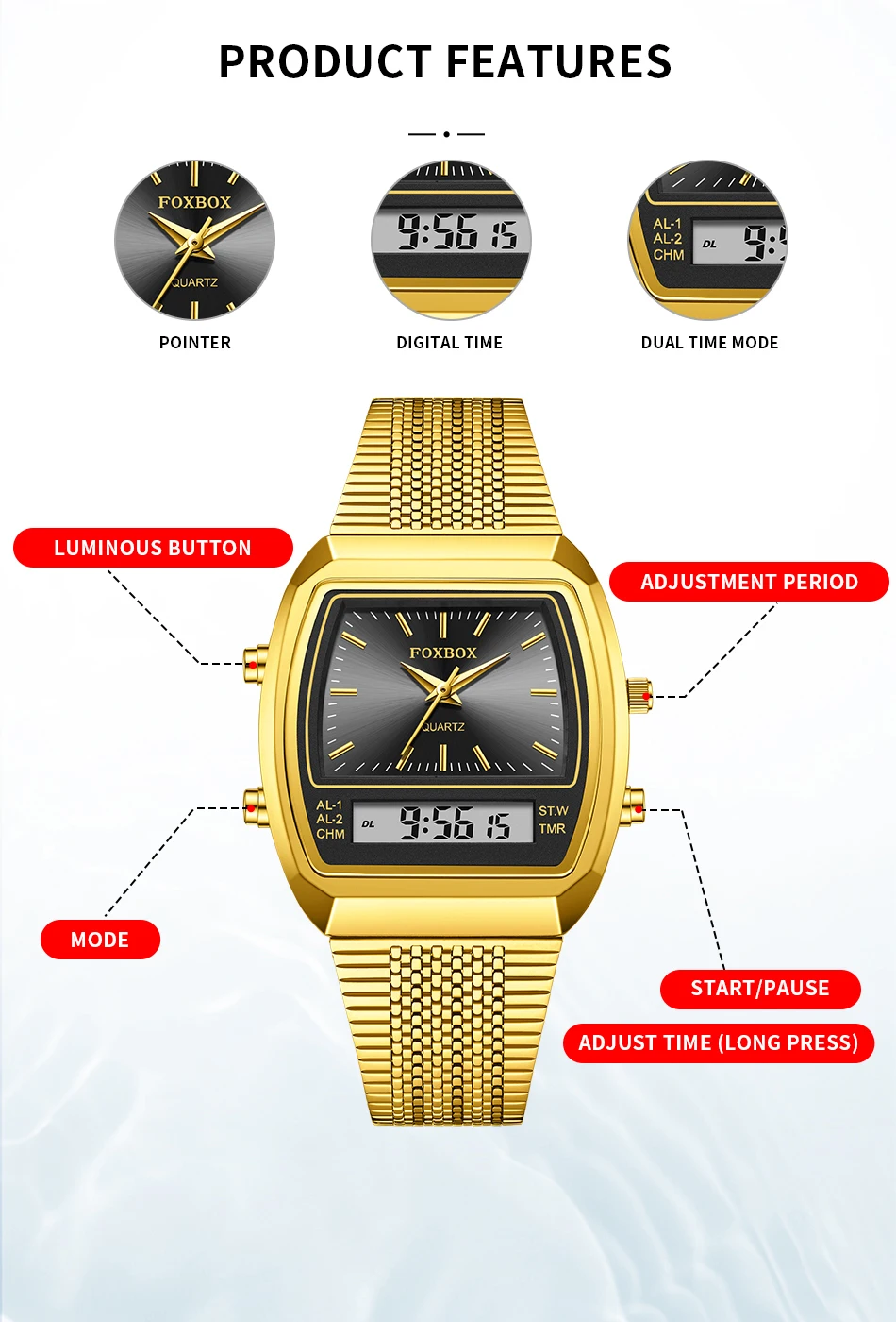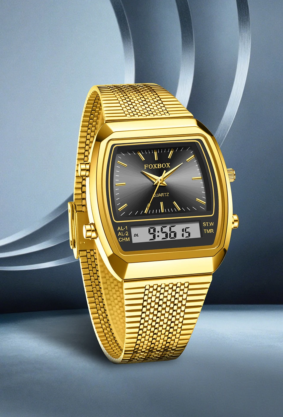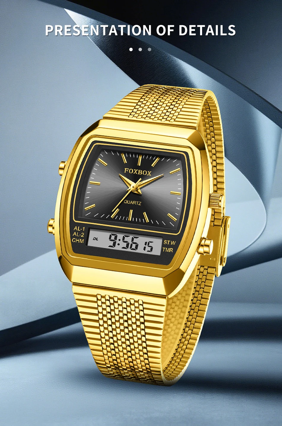 Foxbox Fashion Golden Steel Strap Quartz Sport Watch Men Dual Time Week Display
