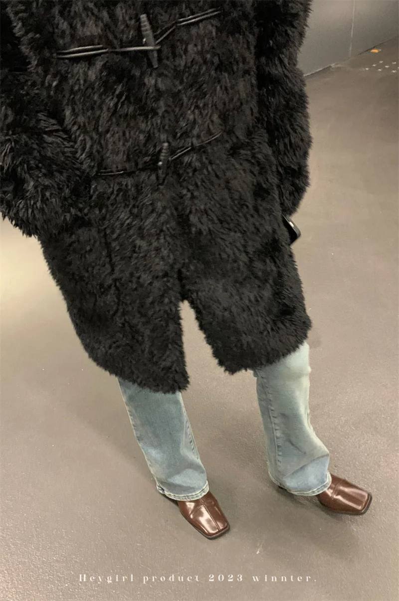 HEYGIRL Black Brother Teddy Pupu Chao Leather Loop Cow Horn Buckle Warm Loose Im