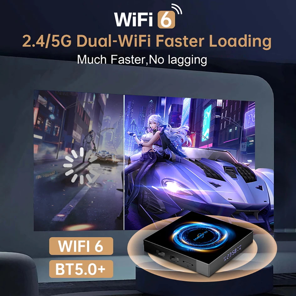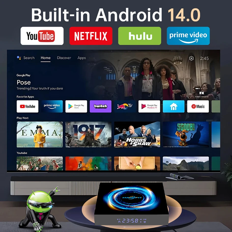 Operating System: Android 14.0. The latest Android set-top box system, offering enhanced stability, security, and energy efficiency.