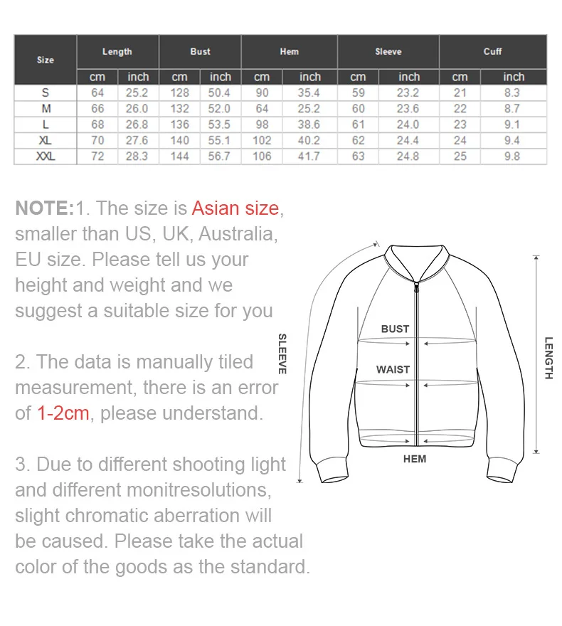 1. The size is Asian size, smaller than US/UK/EU/Australia size. You'd better choose 1-2 sizes larger. If you are not sure about it, please tell us your height and weight and we will suggest a suitable size for you.2.The data is manually tiled measurement, so there is an error of 1-2cm. Please understand.3.Thank you for purchasing in our store. Remember to provide your full name, detailed address, zip code, phone number. So that you can receive your package successfully.