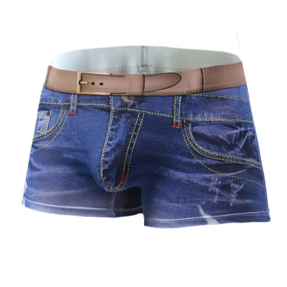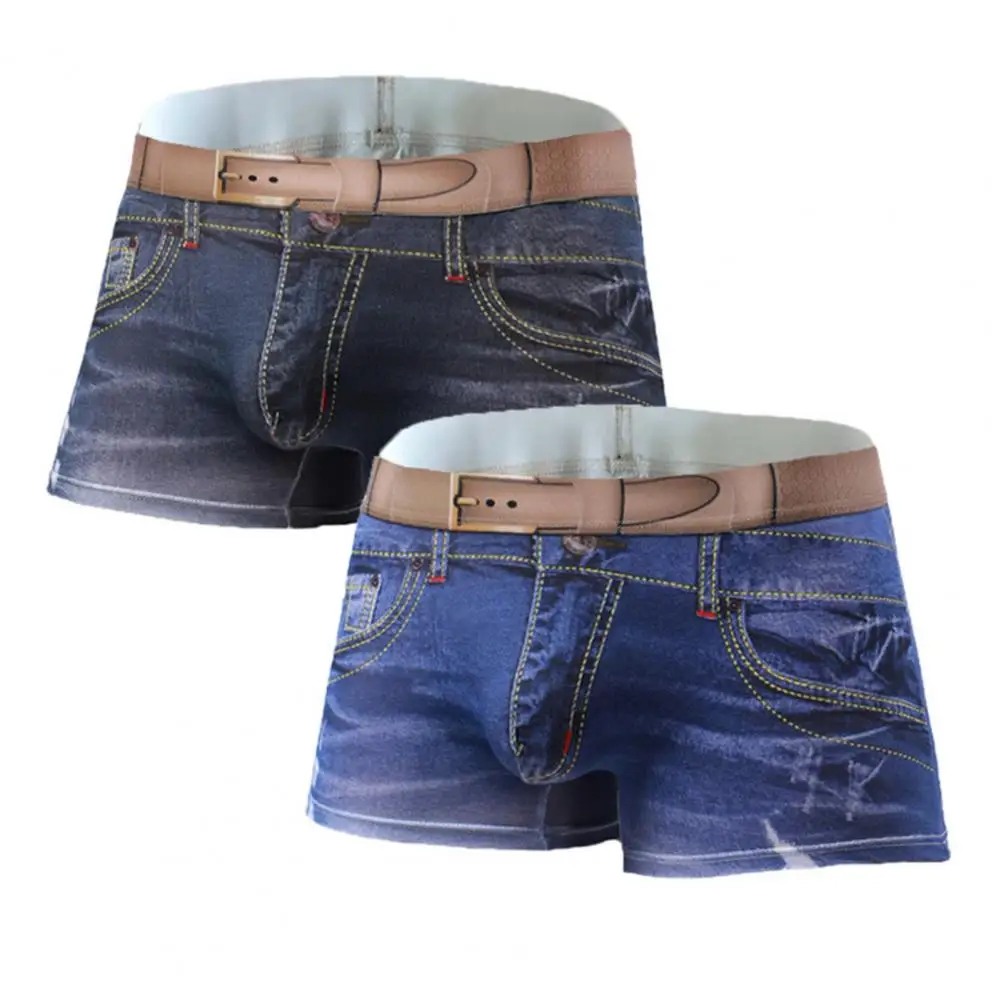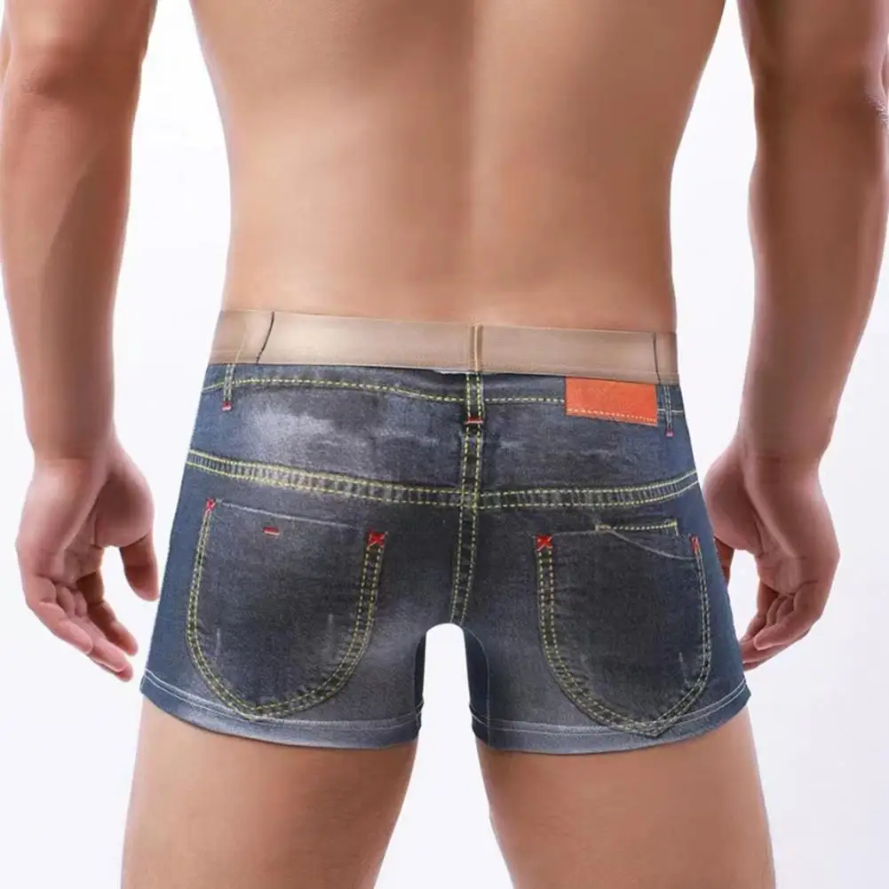 Men Boxer Underwear Imitation Jeans 3D Printed Boxer Briefs Mid-rise Elastic Waistband Double-Sided Reinforcement Panties