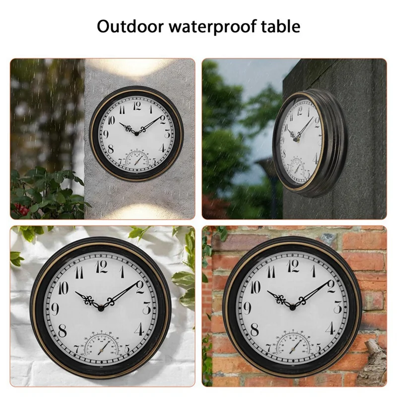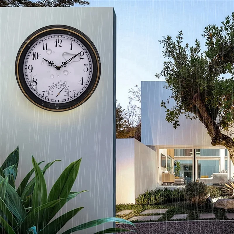 The Outdoor Waterproof Wall Clock with Thermometer is a stylish and functional addition to any outdoor space.