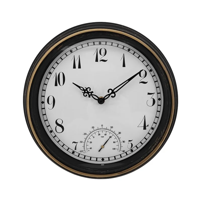 This 12-inch vintage round clock features a built-in thermometer with an IP44 waterproof rating, making it suitable for outdoor use.