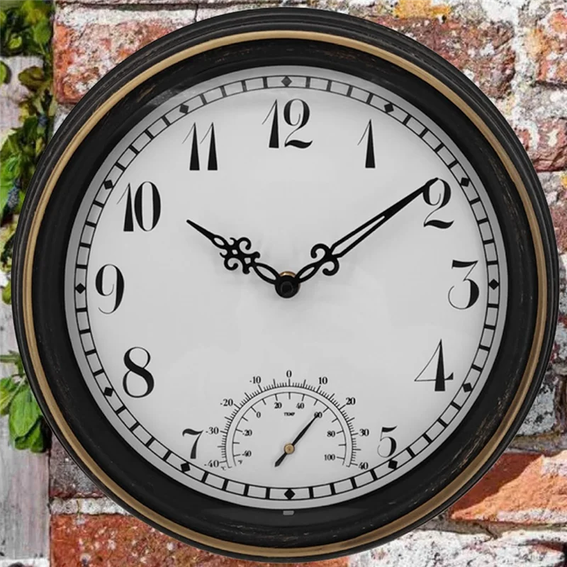 Outdoor Waterproof Wall Clock With Thermometer IP44 Vintage Round Garden Decor C