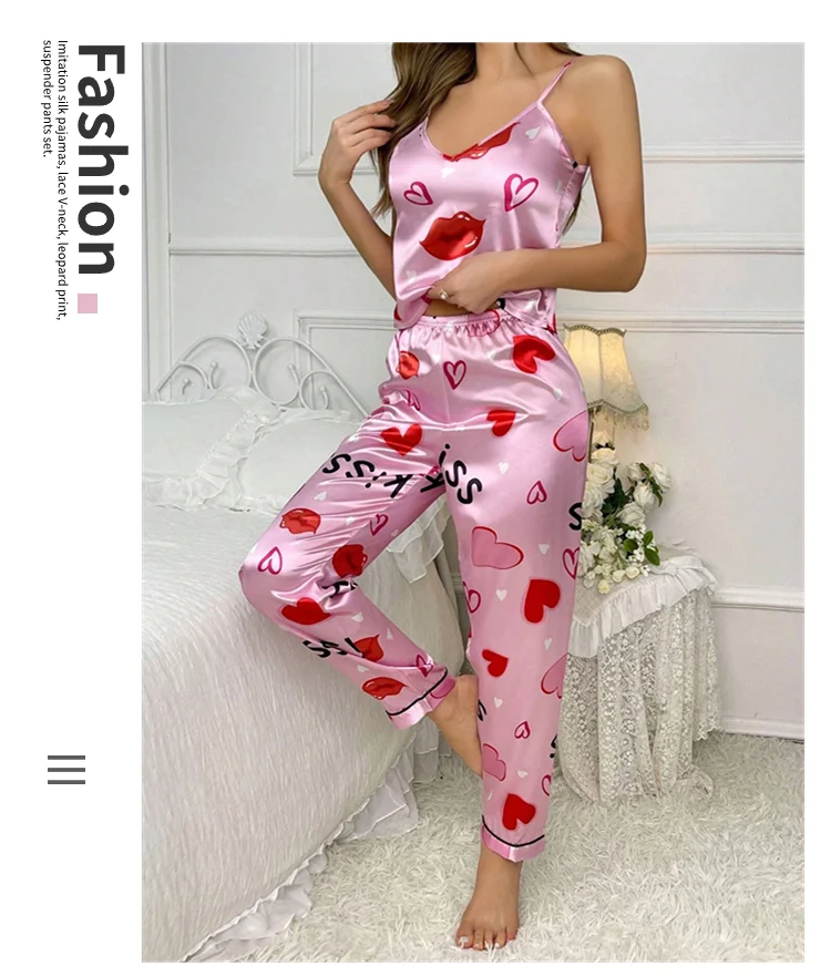 Feature: sleeveless, spaghetti strap, v neck, printed, cami top & Long Pants, Pajama 2 piece set
