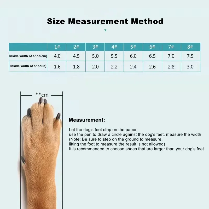 Hello, dear friend, the picture below shows the measurement of the dog's foot size and how to choose the right shoes, if you are not sure you can contact us in advance to avoid buying the wrong size, thank you!