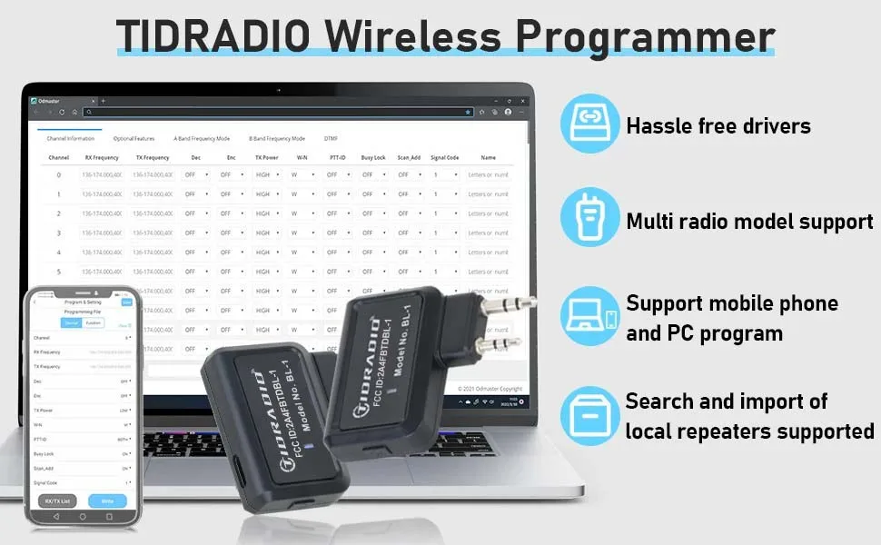 NOW!!! It can connect to PC's Bluetooth and program the radio directly in the Odmaster Web. Also supports importing CHIRP CVS file.--No need to sync to your phone and import again. No plug-in required, just open the ODmaster Web and connect to your computer's Bluetooth. It still supports syncing data to your phone account and then importing it to radio. The first time you use login web, you need to open the login permission in APP, Setting-PC Programming-Open✔【Customize Your Walkie-talkie Quickly】APP works with your mobile phone to quickly program, quickly connect to the nearest repeater, customise the buttons of the radios, share the frequency scheme between the same models, and more function. More convenient and smarter than Chirp, you can use Web Odmaster batch prog on PC)