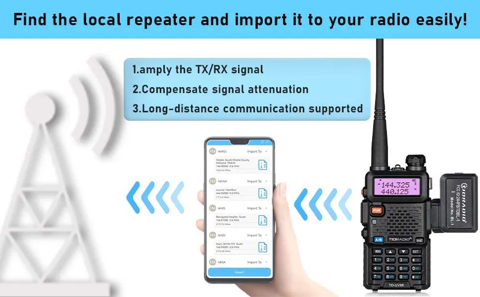 ✔【One-click to Import Local Repeater】Import your nearby repeater configuration into your radio easily and quickly. Help your radio to reach local Repeater to get a better communication range.Set the distance in the upper right corner, then get nearby repeaters list, select the channel you want to import, click "Import", and "save" it (if you didn't change others channel or data, no need to click "Write", just "Save" it ).